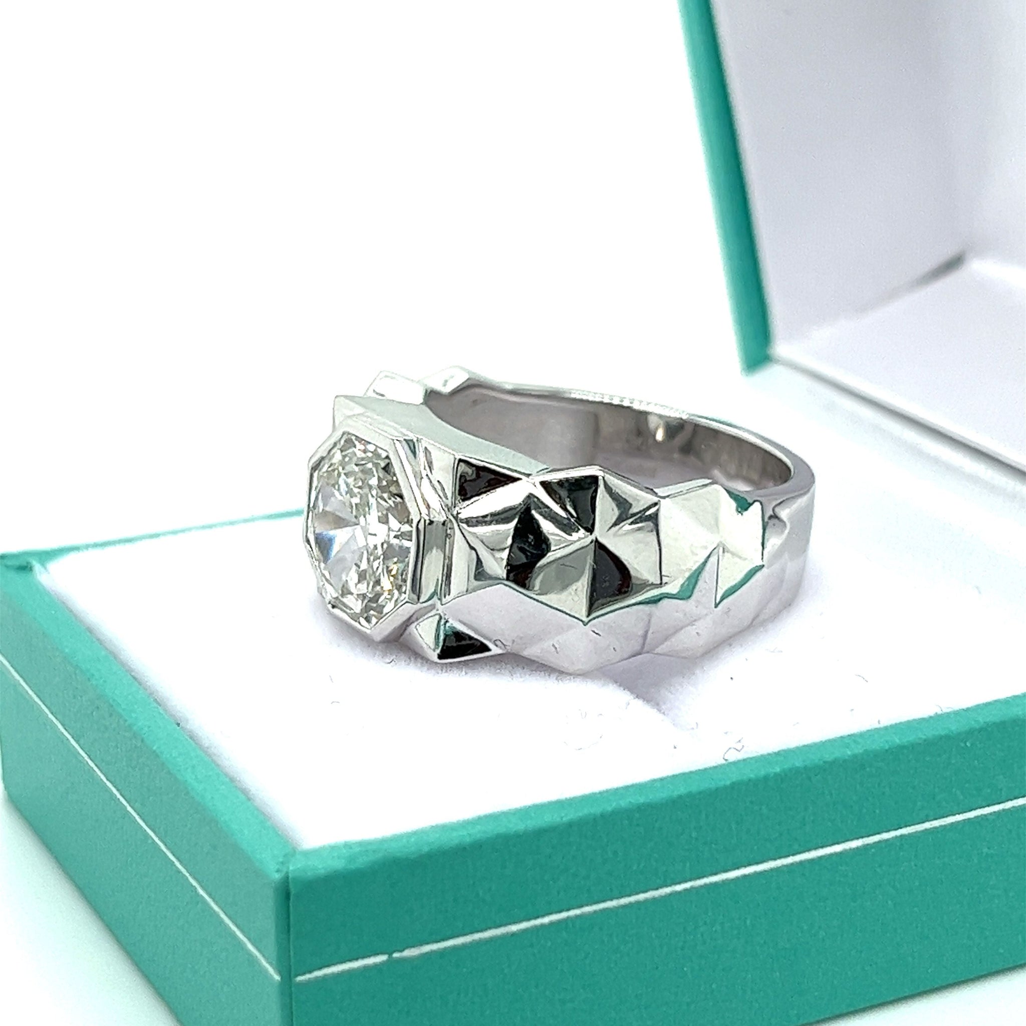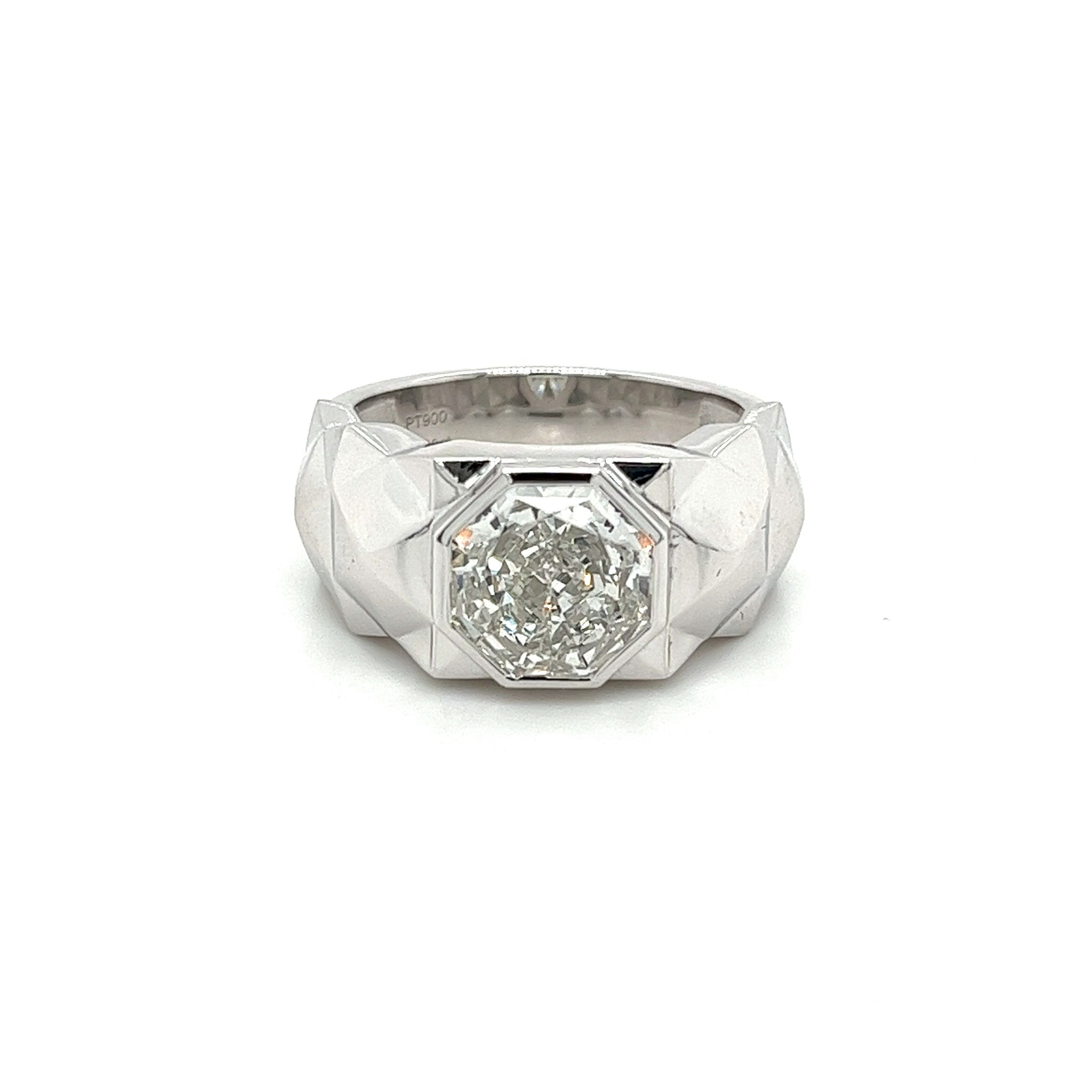 IGI Certified 4.48 carat octagonal cut lab-grown diamond CVD set in a bezel set textured platinum ring. This men's textured platinum ring features a rocky finish with a sharp bezel setting. A gorgeous marriage of symmetry and contrast. The center stone is eye-clean and full of life. An unusual octagon cut with vibrant facets that sparkle from any angle. A ring for those in search of something better than the ordinary. A true statement piece.