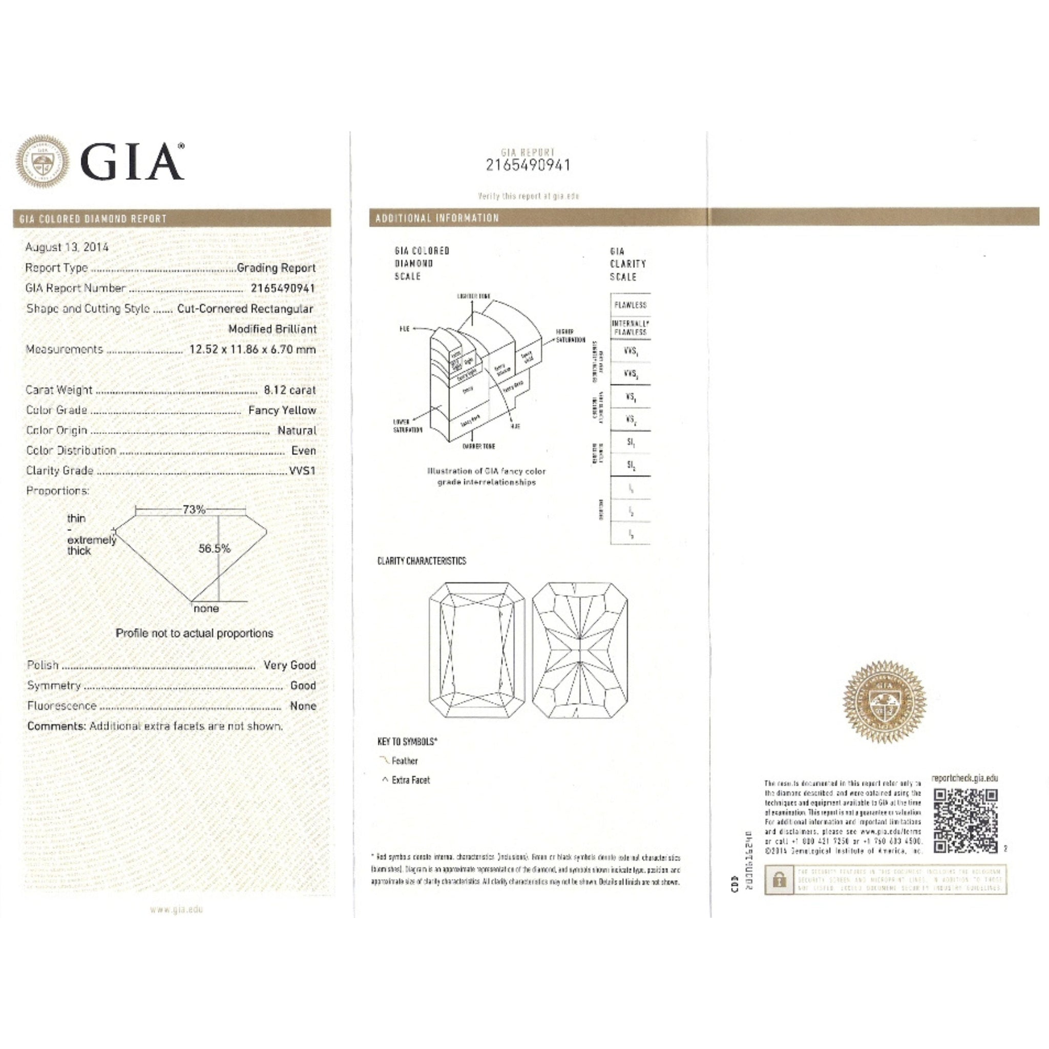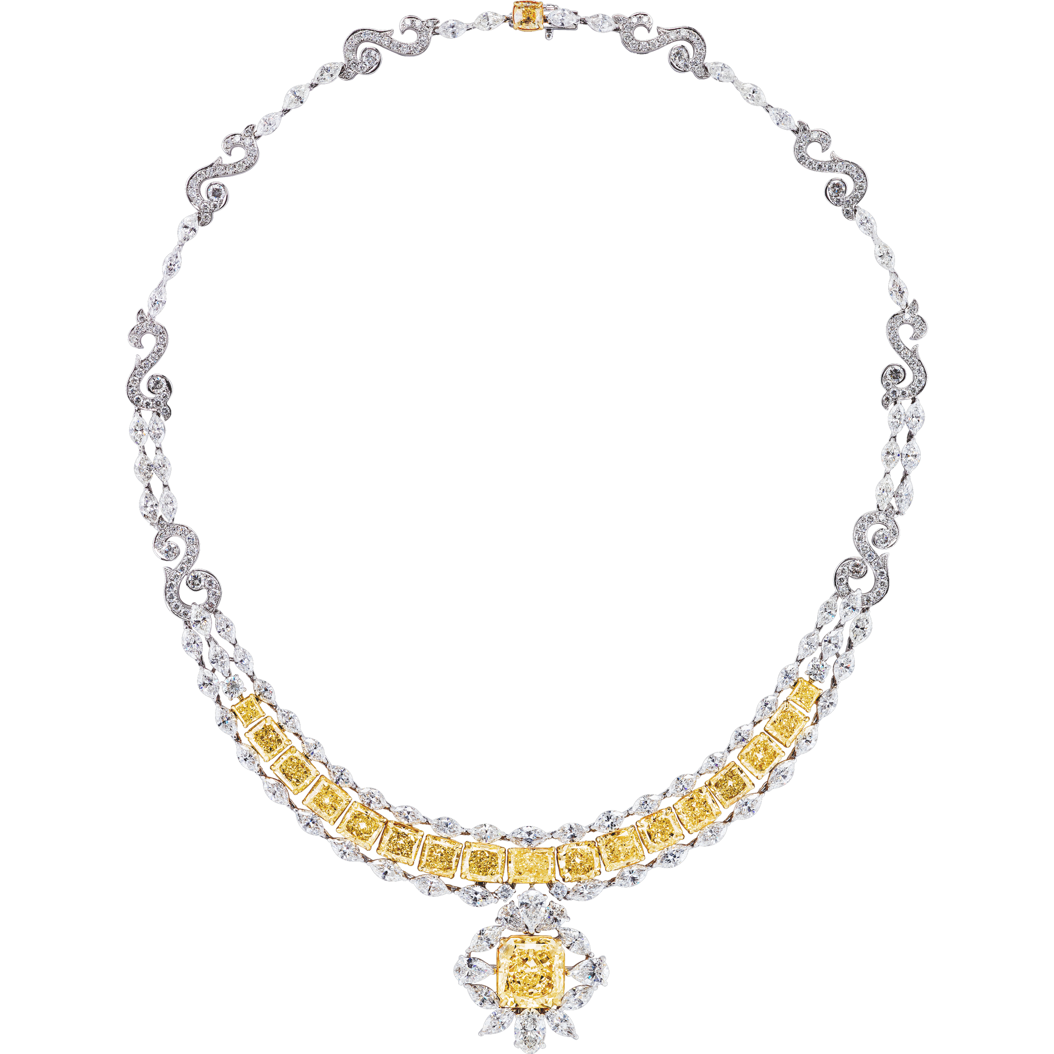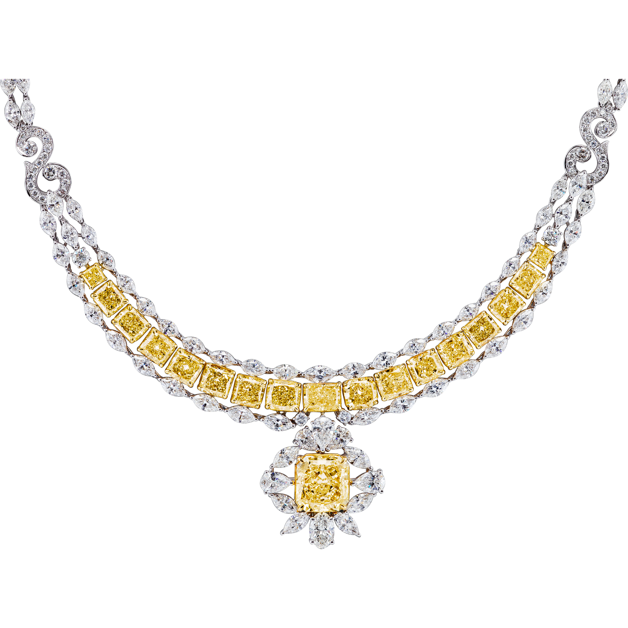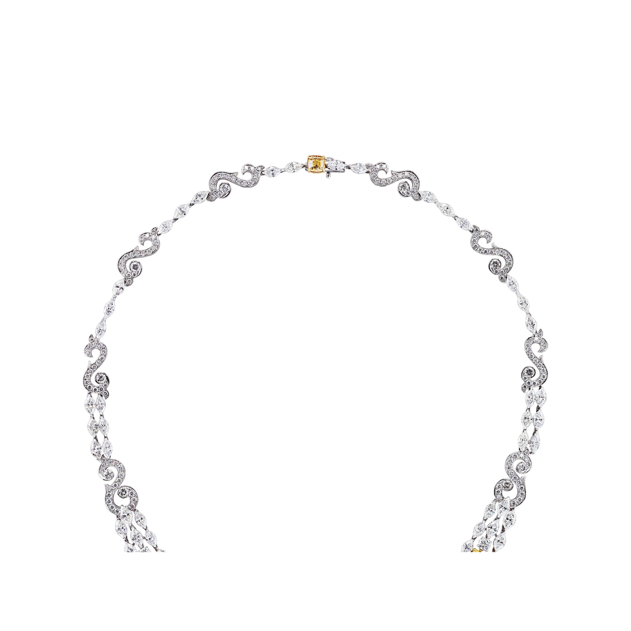 At the heart of this opulent piece lies a GIA certified 8.12 carat radiant-cut fancy yellow diamond, boasting “VVS1” clarity. A mesmerizing symphony of 17 additional fancy yellow diamonds gracefully cascade along the necklace, elegantly arranged in a curving parallel structure. These fancy yellow radiant-cut diamonds weigh 19.63 carats TW and exhibit a range of “VVS1-VS2” clarity.