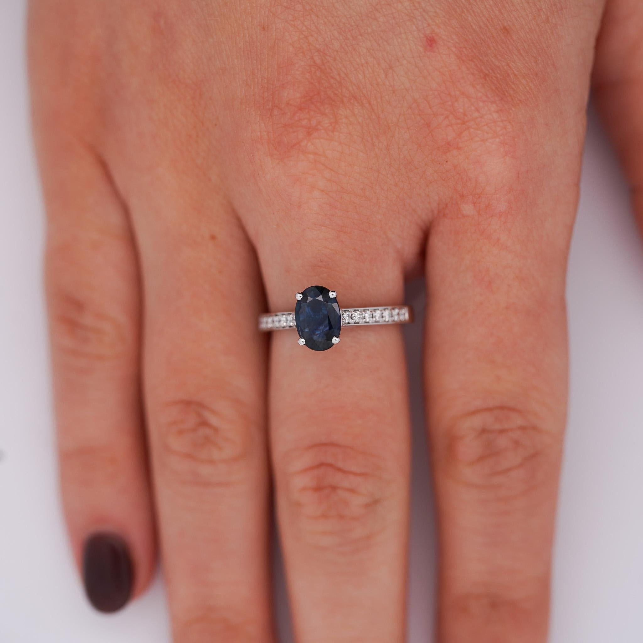 Dieser elegante Ring fängt die Faszination eines tiefen, satt gefärbten Saphirs ein, der in 18 Karat Weißgold gefasst ist und eine nahtlose Verbindung von Eleganz und Charme bietet. Der ovale Schliff des Mittelsteins unterstreicht seine natürliche Brillanz, während zarte Diamonds das Band zieren und einen dezenten, aber strahlenden Glanz verleihen. Mit zeitloser Ausstrahlung gestaltet, lässt sich dieses Schmuckstück mühelos vom Alltag bis zu besonderen Anlässen tragen. Die schlanke Weißgold-Fassung sorgt für einen glatten, angenehmen Sitz und macht diesen Ring zu einer stilvollen Ergänzung jeder Sammlung.