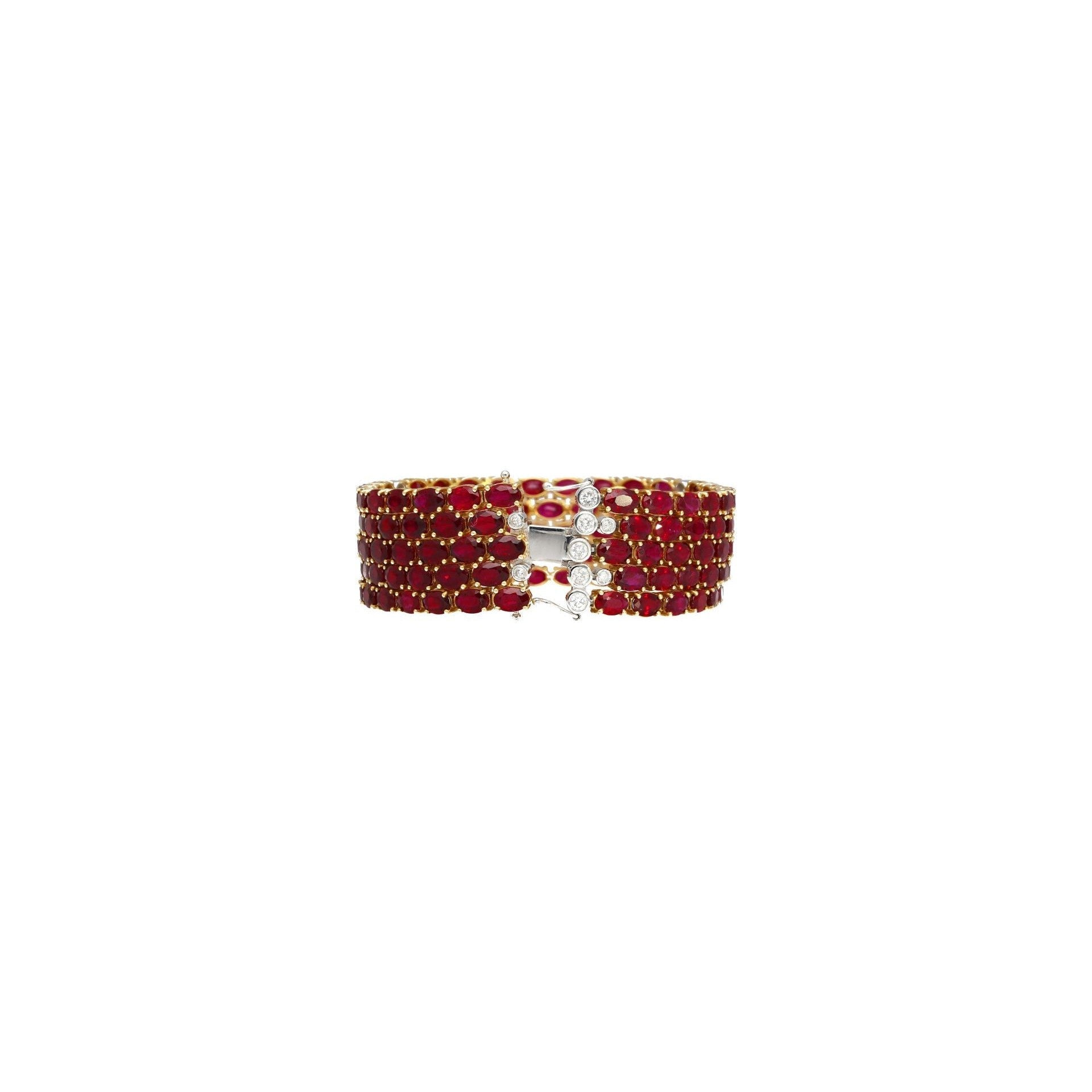 5 rows of oval cut rubies and round cut diamonds. All natural mined gemstones and set in 18k solid gold. A luxury tennis bracelet with excellent coverage on the wrist and secure baskets under each stone ensure this piece can be worn daily.