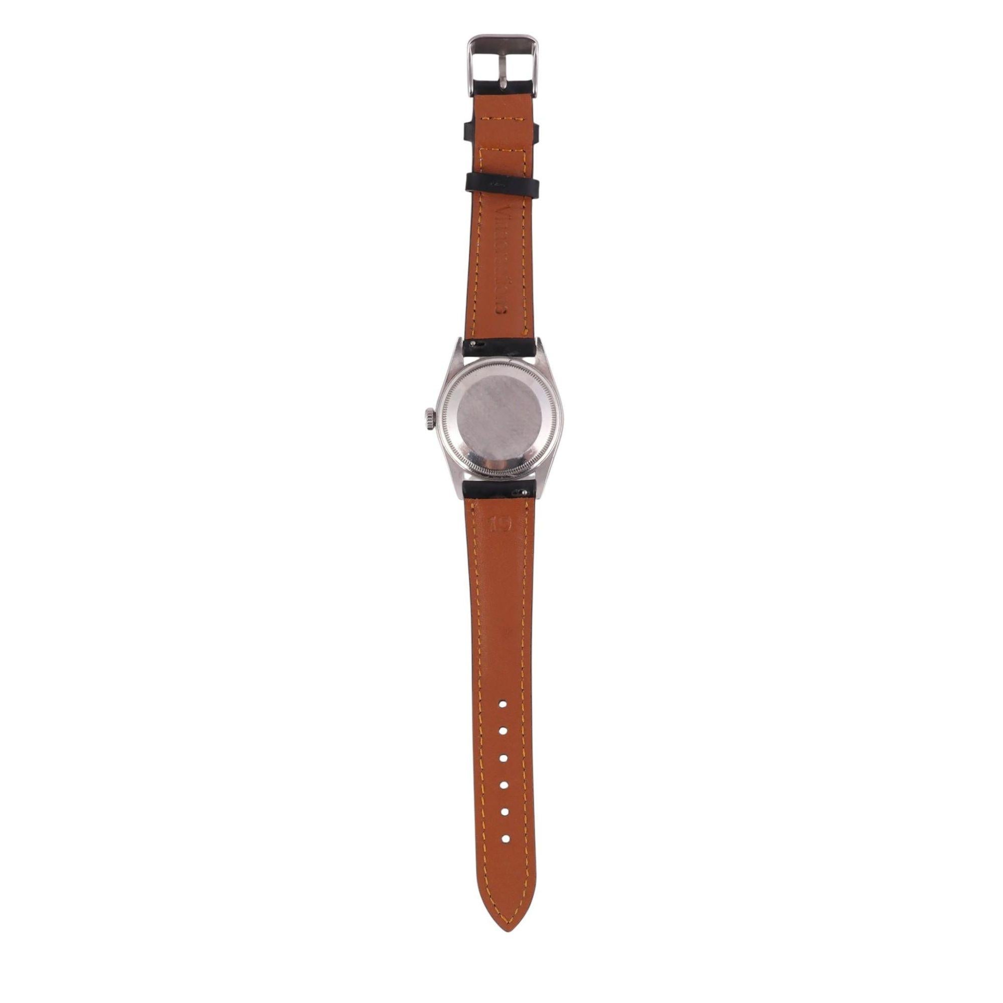 This exceptional Rolex Oyster Perpetual Date reference 15200 showcases the brand's legendary Oyster case design with 34mm diameter providing versatile proportions suitable for both men and women. The stainless steel case features Rolex's patented screw-down crown and case back construction ensuring water resistance through the Oyster case architecture that revolutionized watchmaking in the 1920s. The clean silver dial displays applied baton hour markers offering refined simplicity, while the three-hand configuration with central hours, minutes, and sweep seconds provides clear timekeeping. The date window at 3 o'clock features Rolex's signature Cyclops lens magnifying the date 2.5 times for easy reading, a patented innovation introduced in 1953. The black leather strap with stainless steel buckle offers refined alternative to the traditional Oyster bracelet, creating elegant dress watch aesthetic appropriate for formal occasions.