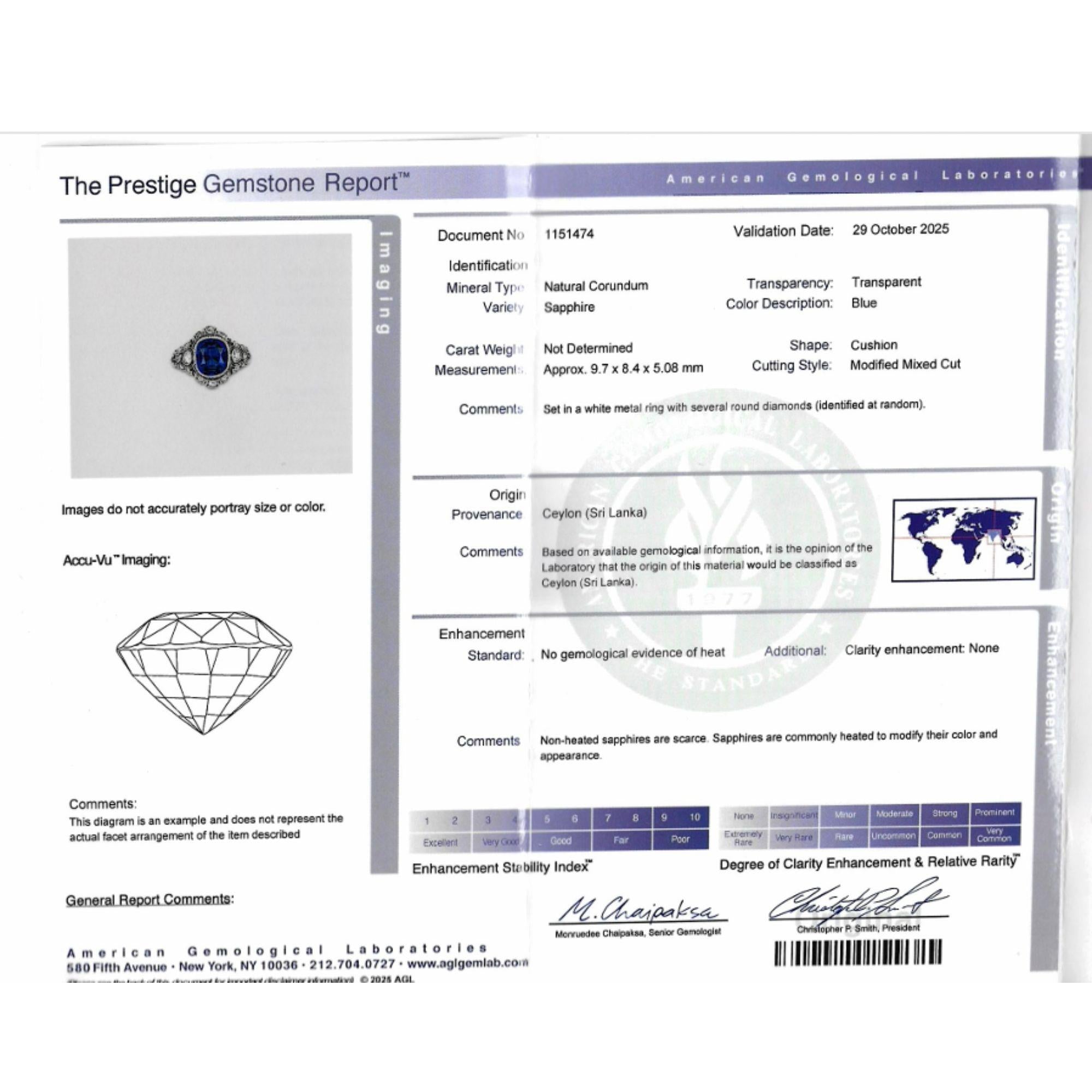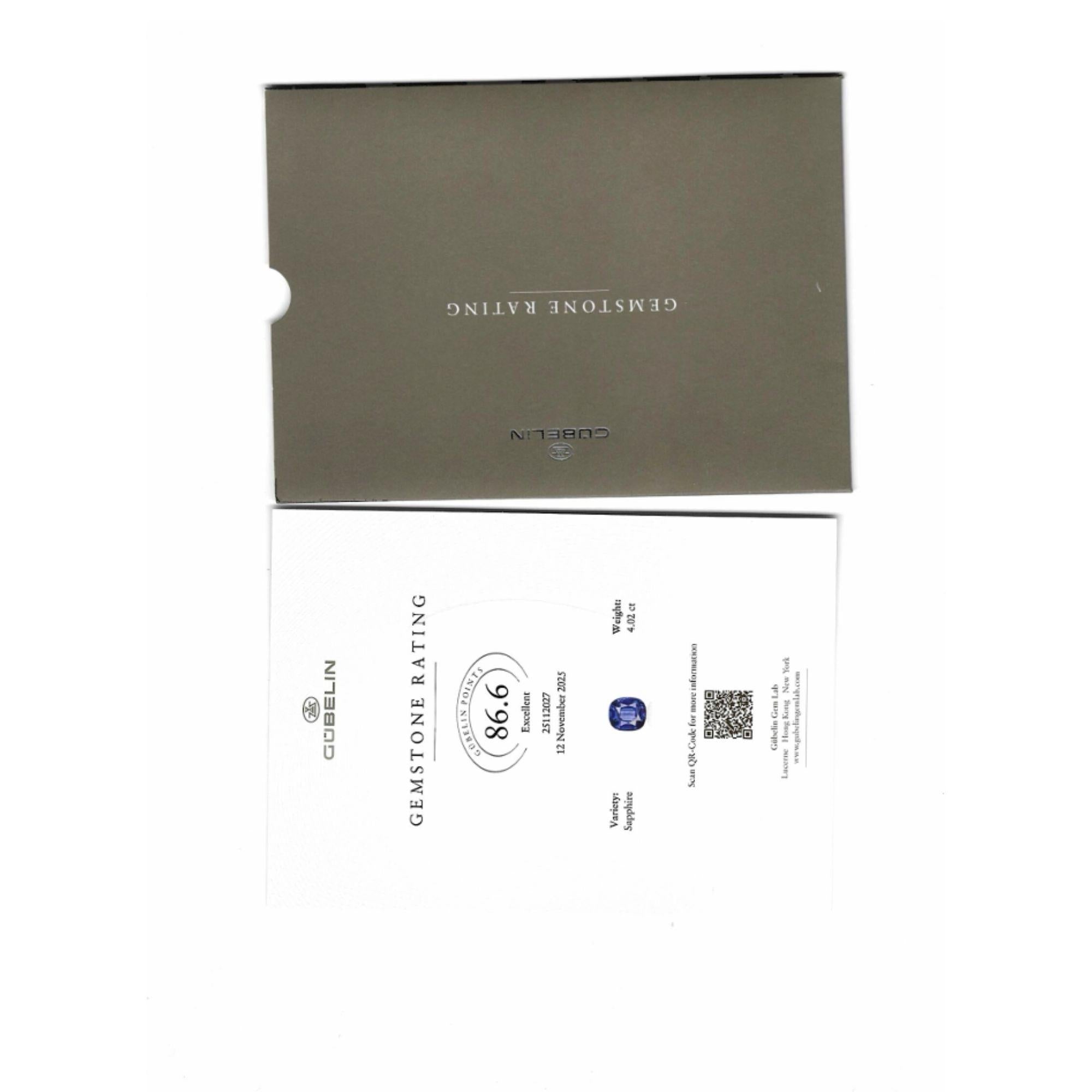 This 4.02 carat Ceylon sapphire exhibits rich royal blue color with exceptional transparency and cushion cut proportions. No-heat treatment designation confirms the stone's natural color without thermal enhancement, significantly increasing value and desirability. Dual certification from Gubelin and AGL, two of the world's most respected gemological laboratories, provides comprehensive authentication and quality documentation. Ceylon sapphires from Sri Lanka remain among the most prized colored gemstones for their superior color saturation and transparency.