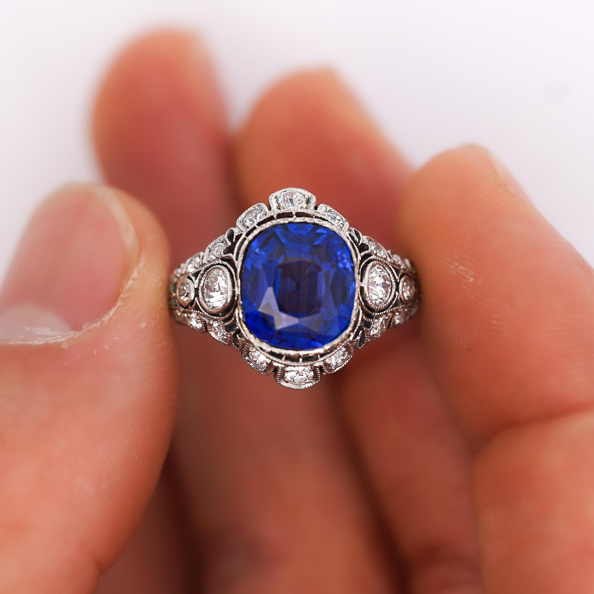 Vintage Art Deco platinum mounting showcases intricate metalwork with geometric precision and ornamental filigree detailing throughout. Cushion-cut sapphire sits within milgrain-edged bezel surrounded by diamond halo creating brilliant frame. Ornate shoulders feature bezel-set diamonds arranged in circular patterns connected by pierced filigree metalwork and black enamel accents. Gallery exhibits openwork construction allowing maximum light entry while maintaining structural integrity. The mounting represents quintessential Art Deco aesthetic with symmetrical design and decorative elaboration.