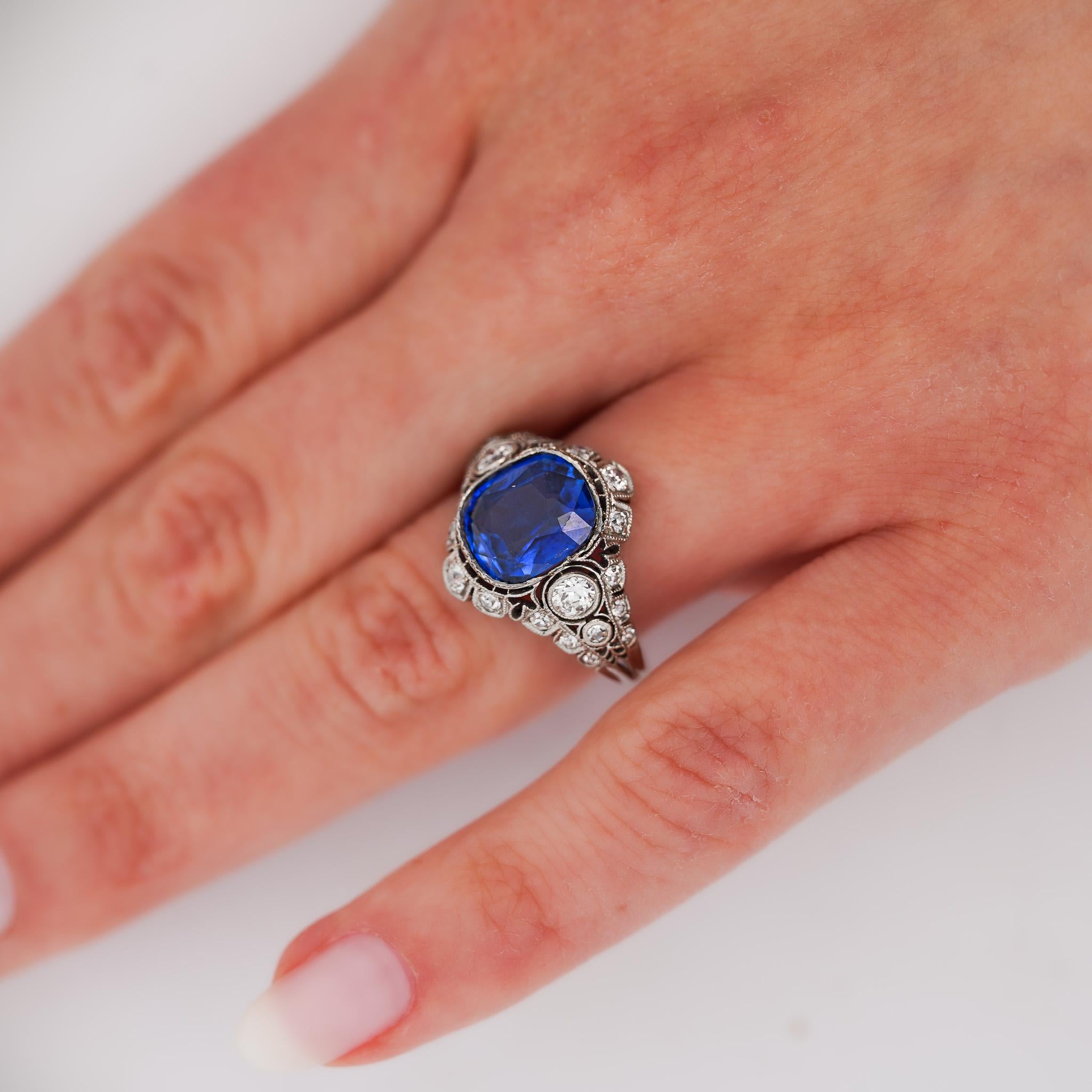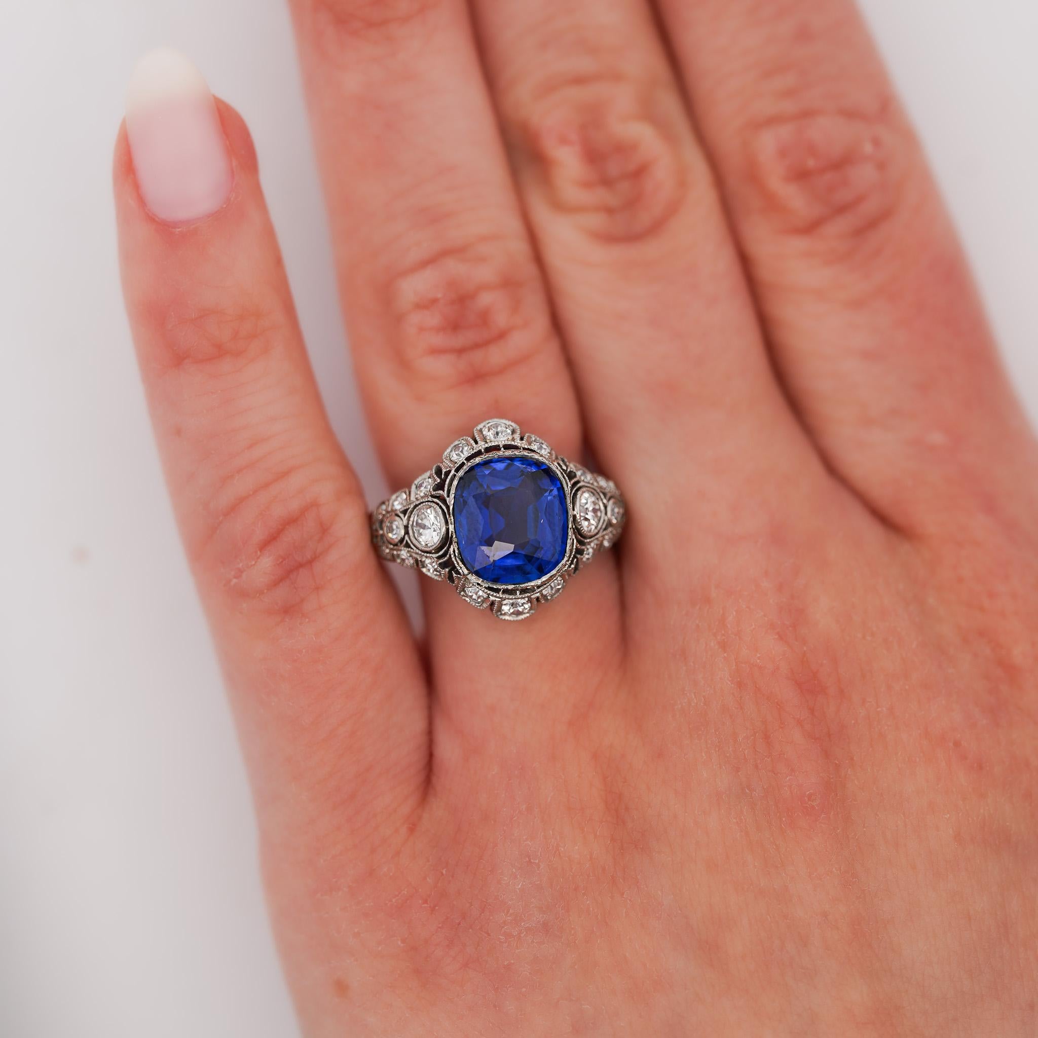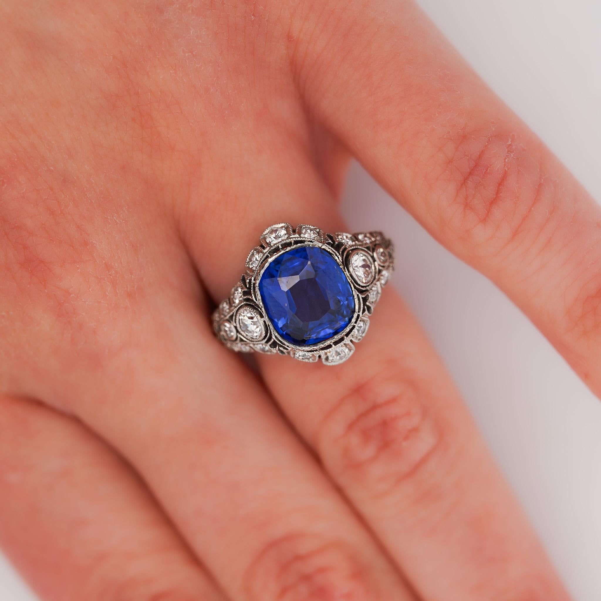 AGL and Gubelin certified no-heat 4.02 carat cushion cut Ceylon sapphire set in vintage platinum Art Deco original mounting with diamond halo, handmade filigree, milgrain, and ornate diamond pierced shoulders.