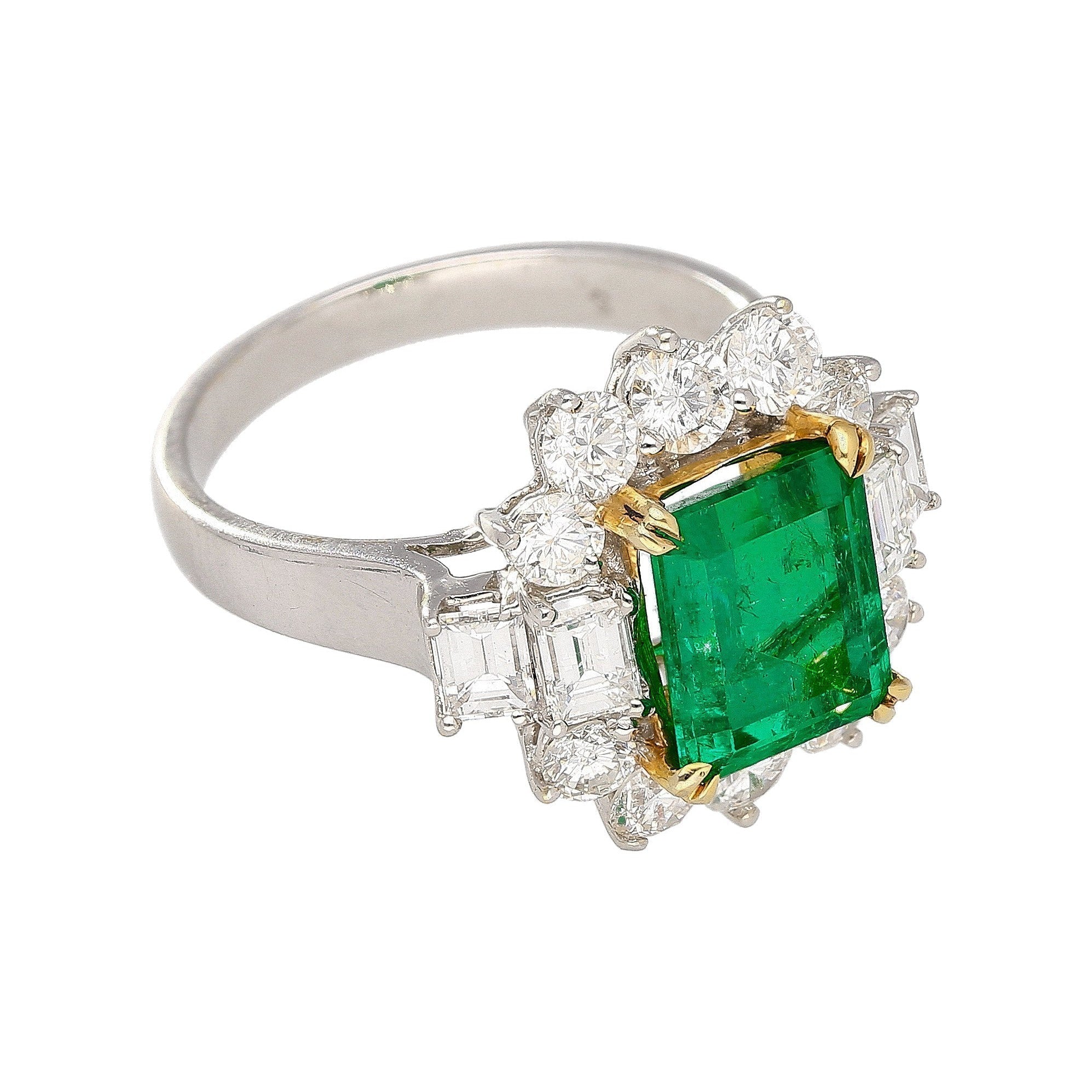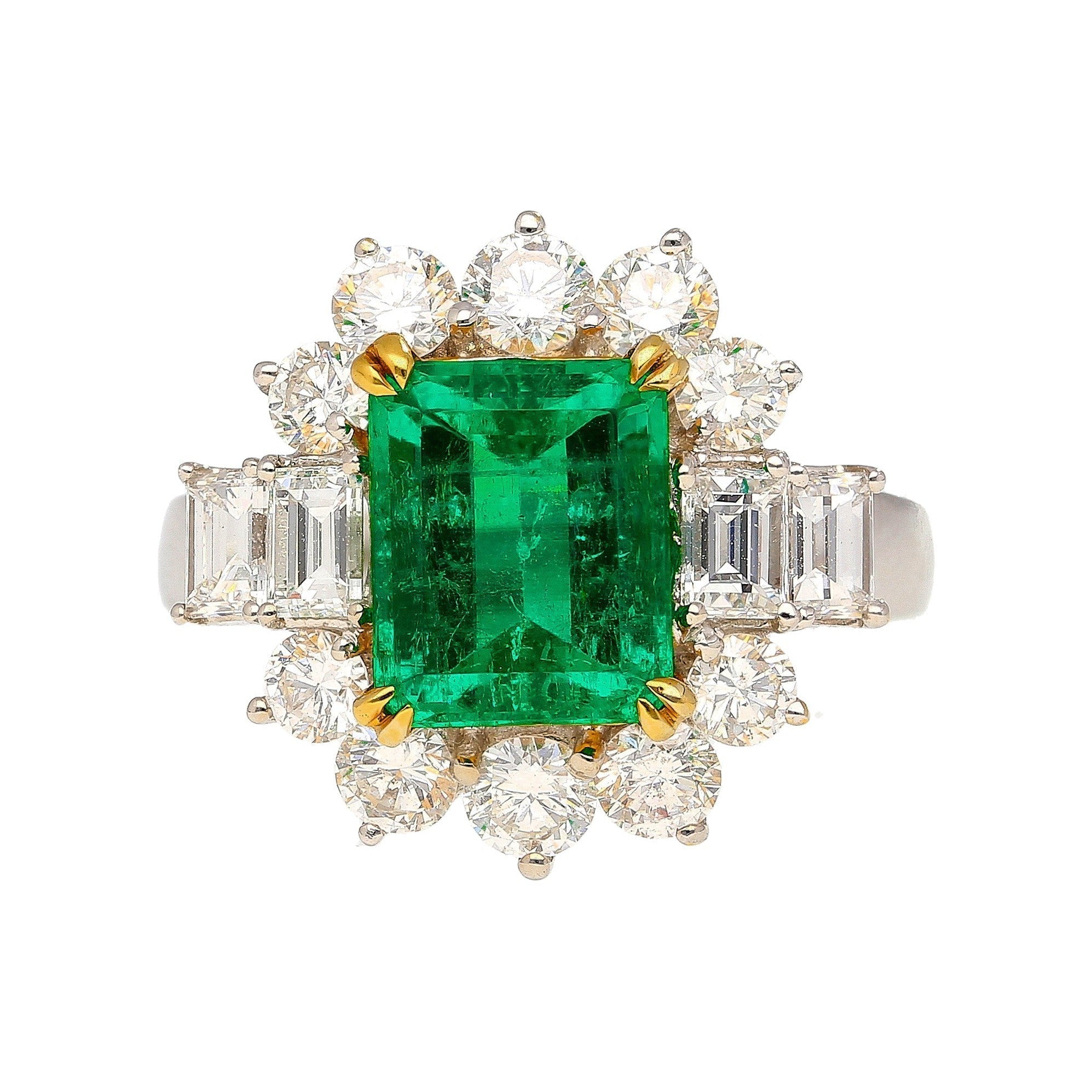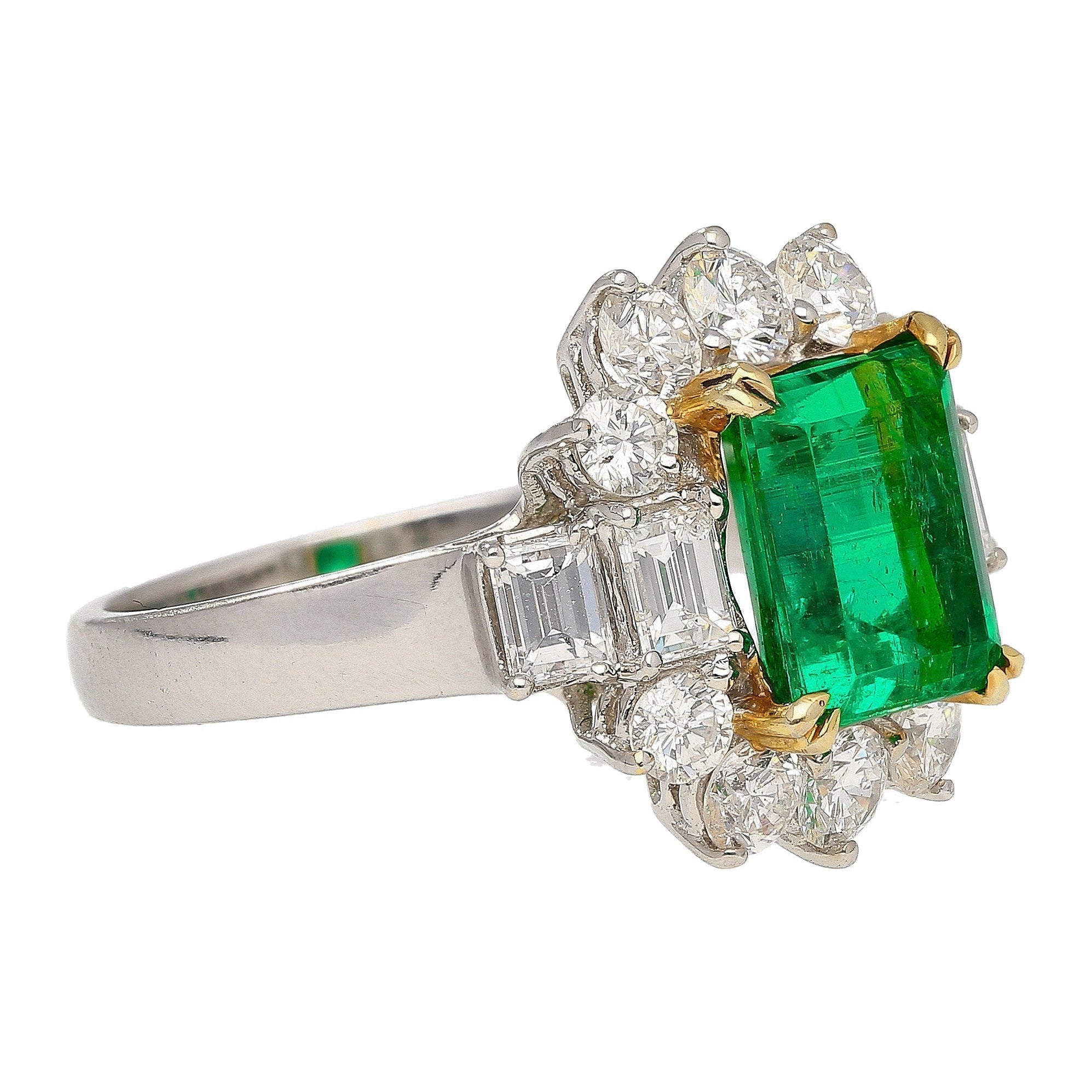 Complemented by 4 emerald-cut diamond side stones beside 10 round brilliant-cut diamonds. All of which are F-G color and VS clarity. This ring is unmistakably valuable to even the untrained eye.