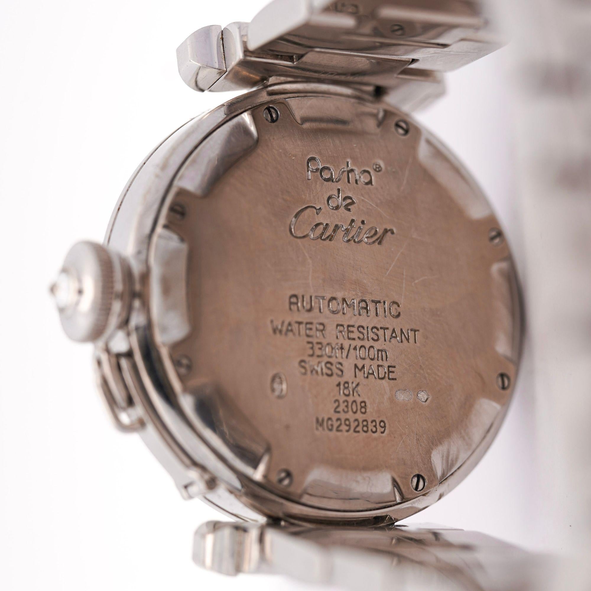 The Cartier Pasha represents one of the most recognizable luxury sports watch designs, featuring the brand's signature round case with exposed screws at the cardinal points and the distinctive protective chain-link crown guard that defines the collection. The 35mm 18K white gold case showcases Cartier's refined proportions—substantial yet elegant on the wrist—with polished surfaces that catch light beautifully. The screw-down exhibition caseback reveals the automatic movement through sapphire crystal, allowing appreciation of the mechanical artistry within. The fluted crown with blue sapphire cabochon displays classic Cartier detailing, protected by the iconic hinged grid that can be secured with a small chain. The integrated bracelet features Cartier's distinctive architectural link design with polished surfaces creating seamless flow from case to clasp. Weighing 156.9 grams, this substantial timepiece delivers impressive wrist presence while the hidden deployant clasp maintains clean lines. The included extra 0.5 inch link allows customizable fit.