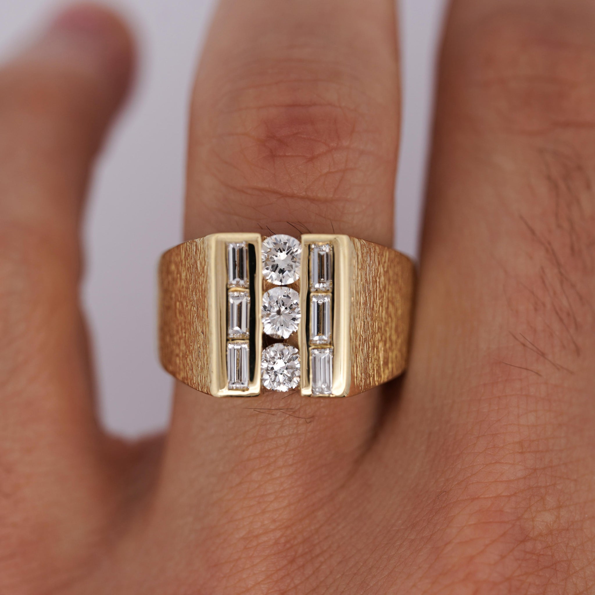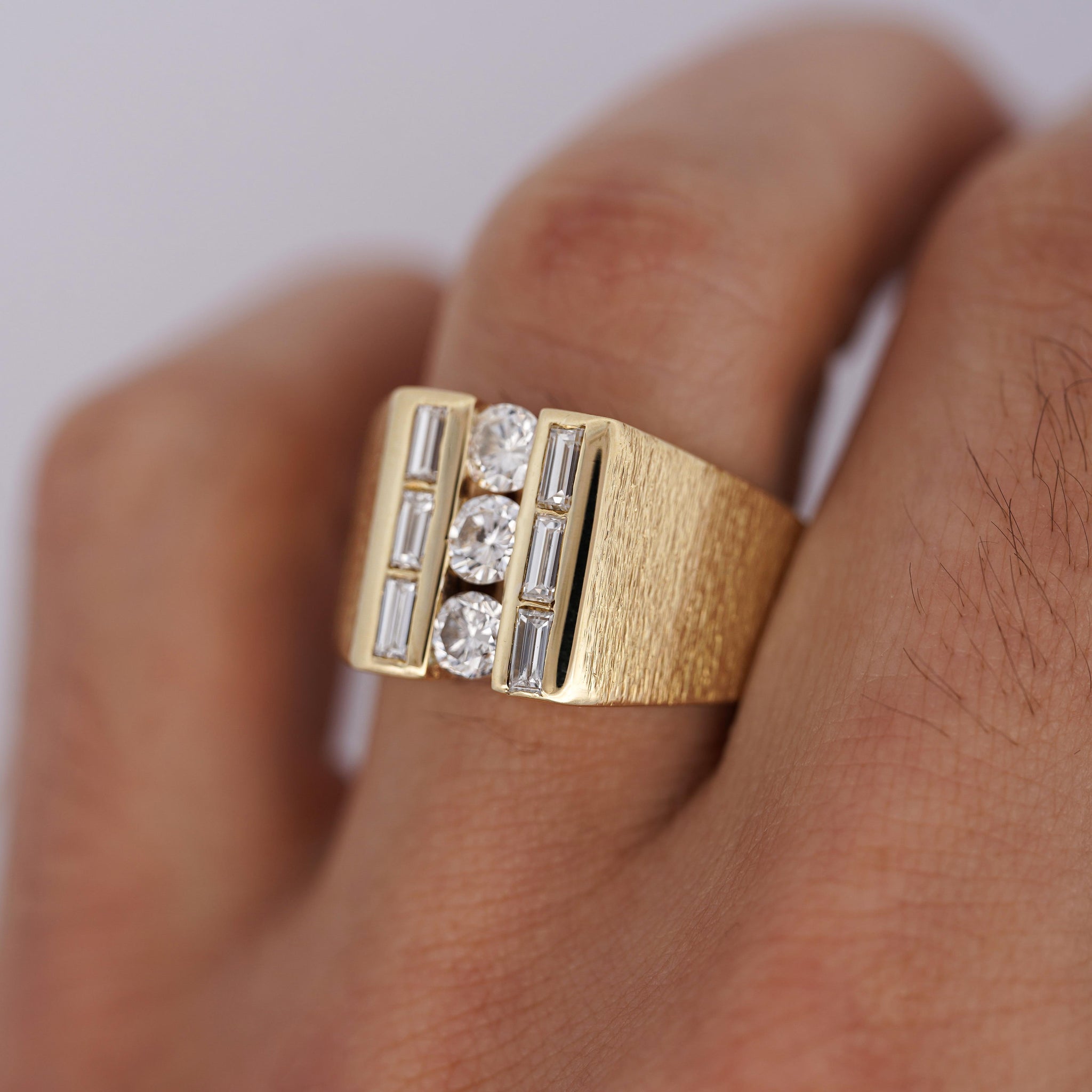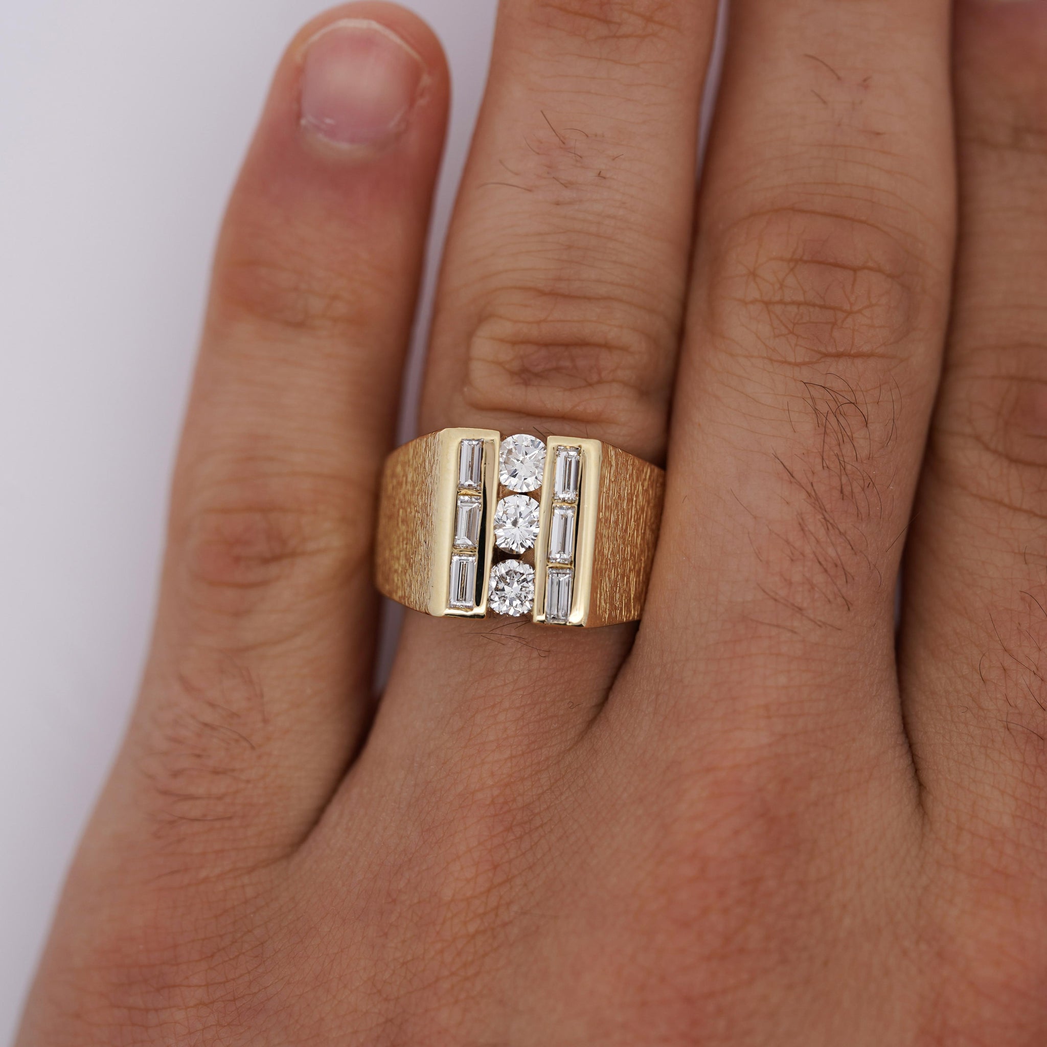 Natural 1 Carat Round & Baguette Cut Diamond in 18K Yellow Gold Matte Mens Ring