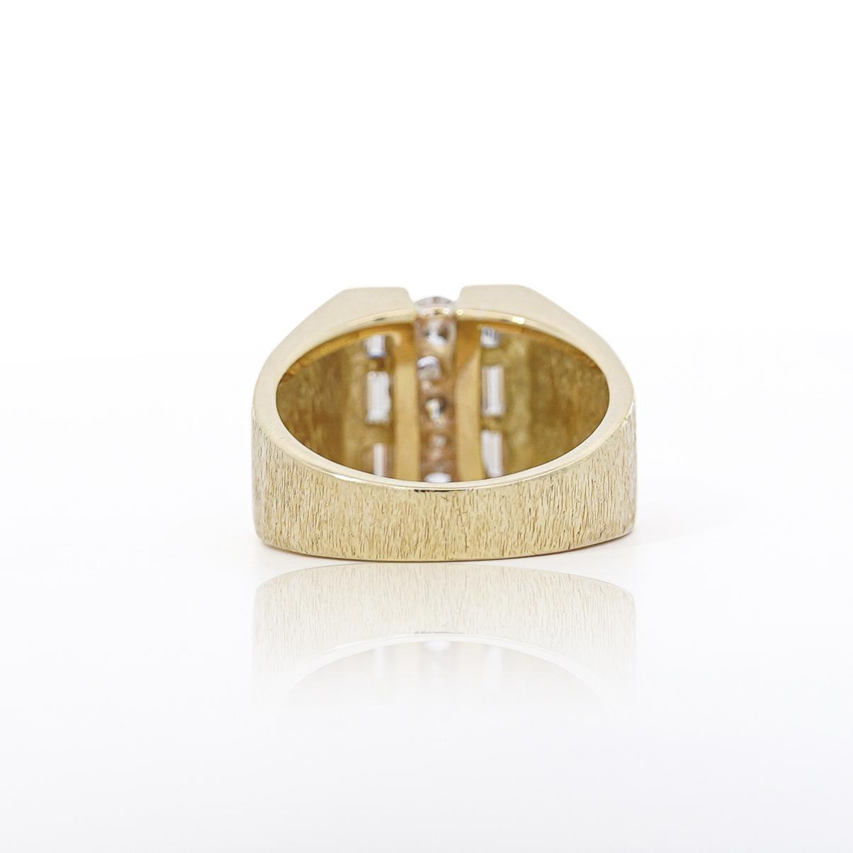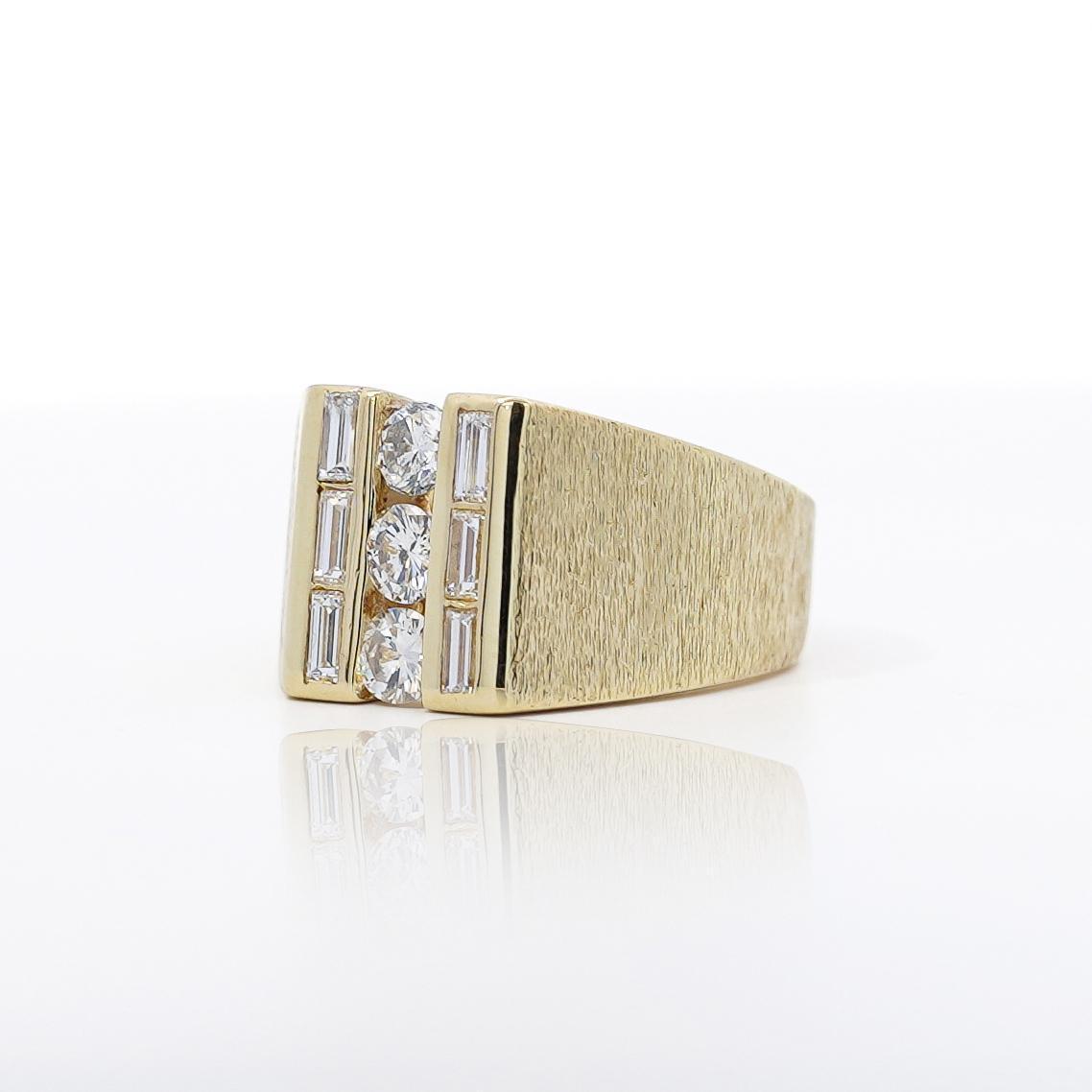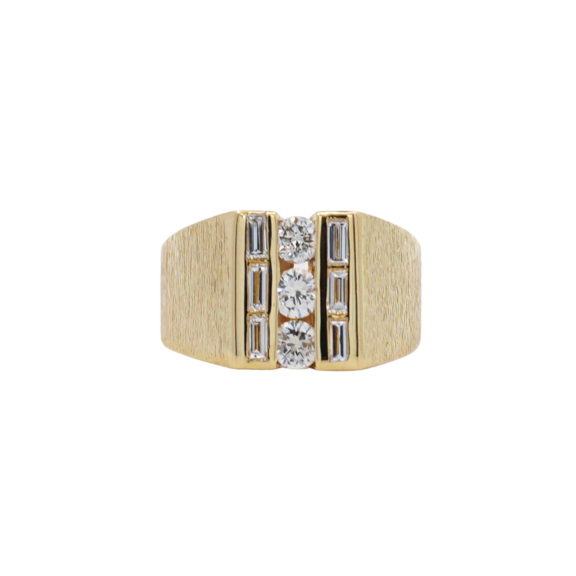 Natural 1 Carat Round & Baguette Cut Diamond in 18K Yellow Gold Matte Mens Ring
