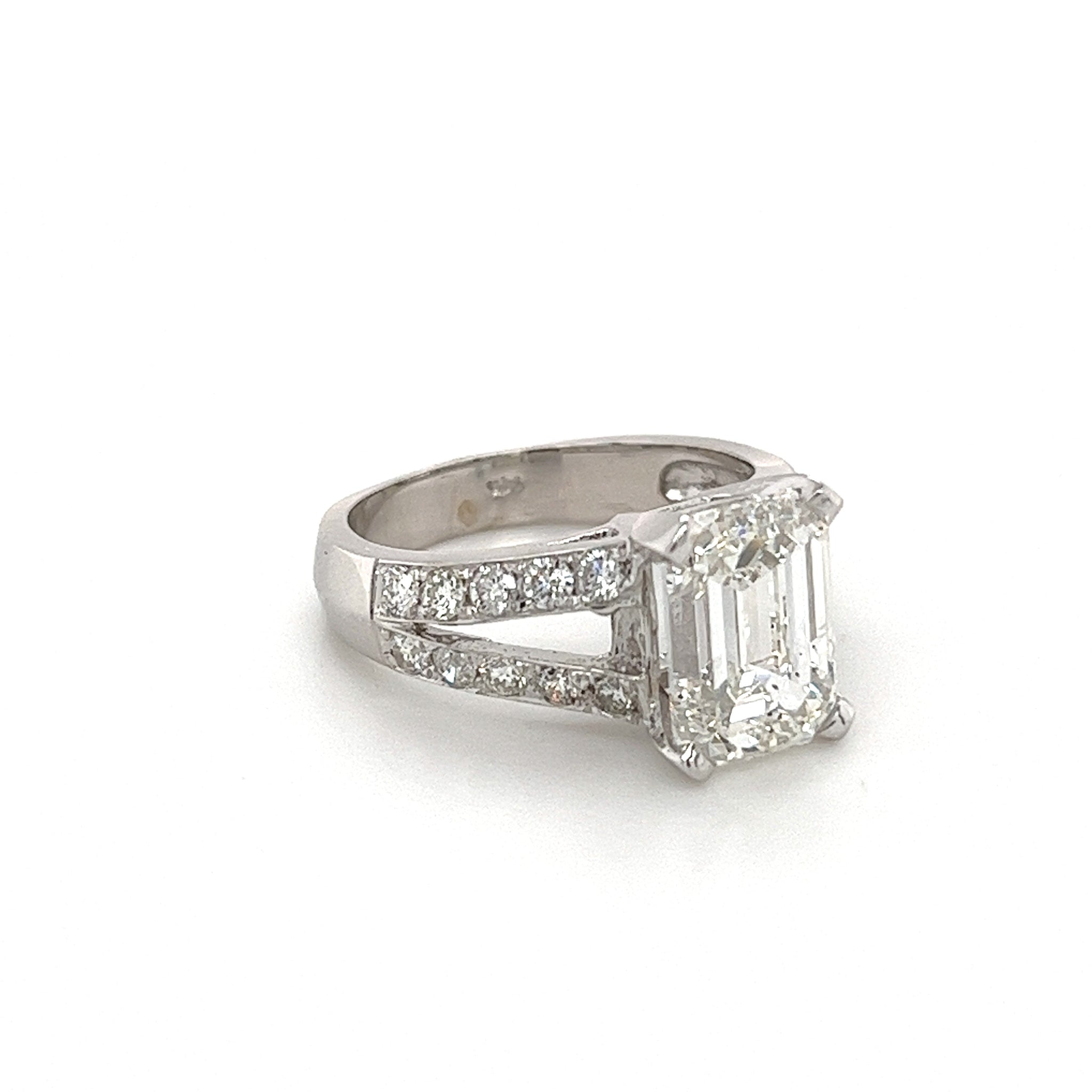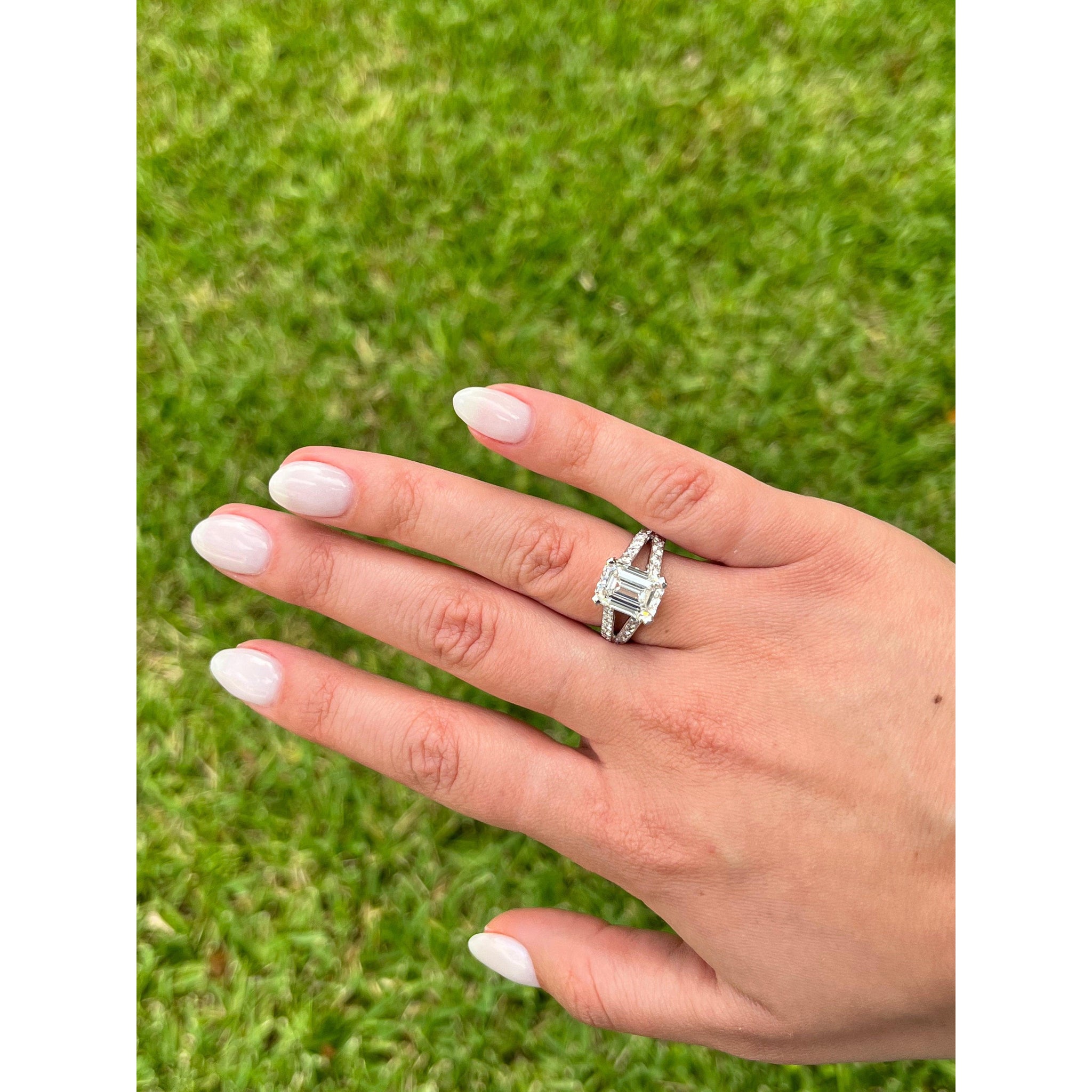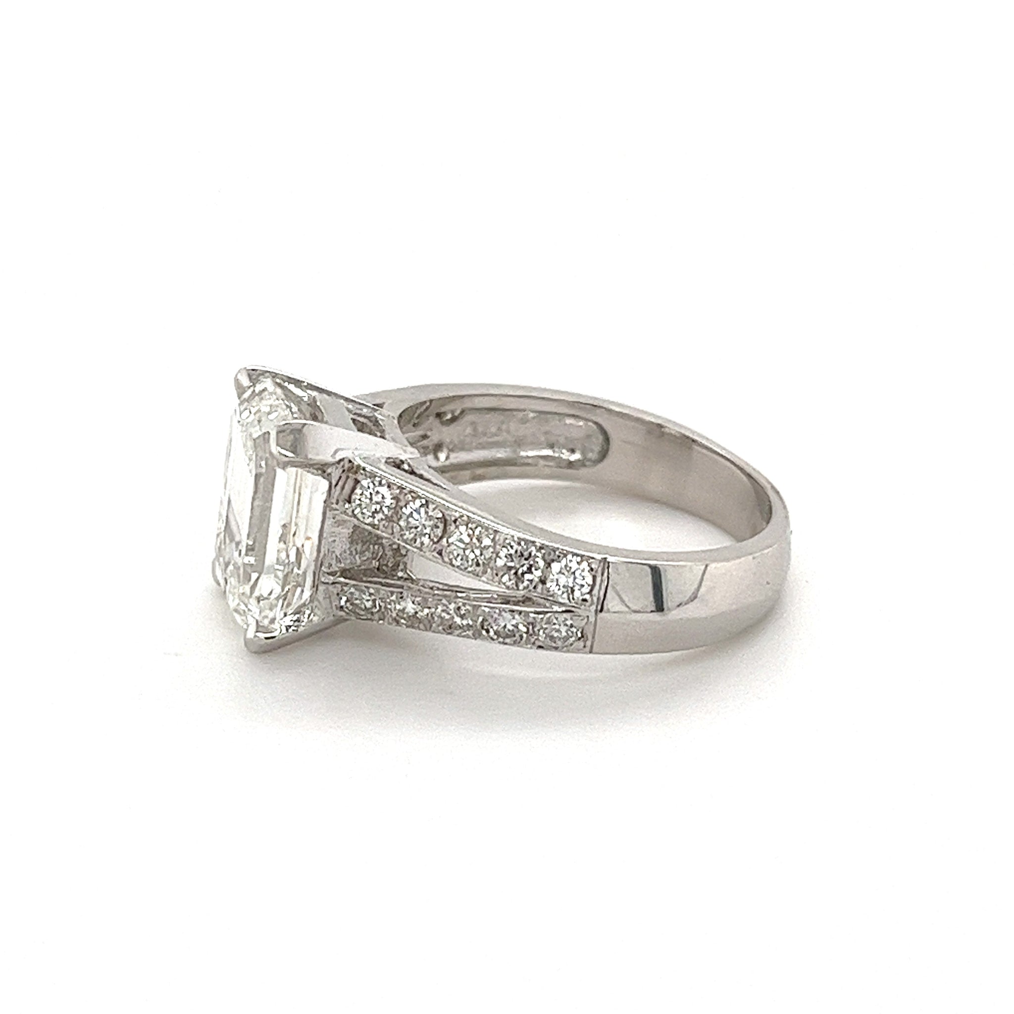 4.01-carat Emerald cut Lab-grown diamond Engagement ring in white gold. 4.01 carat, emerald cut, G color, SI1 clarity. The stone is set in a split shank white gold side stone ring with 1.20 carats in natural diamond side stones.