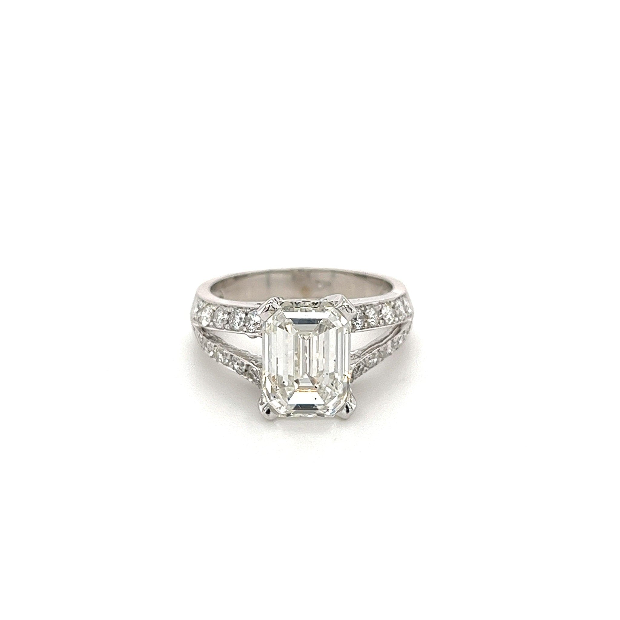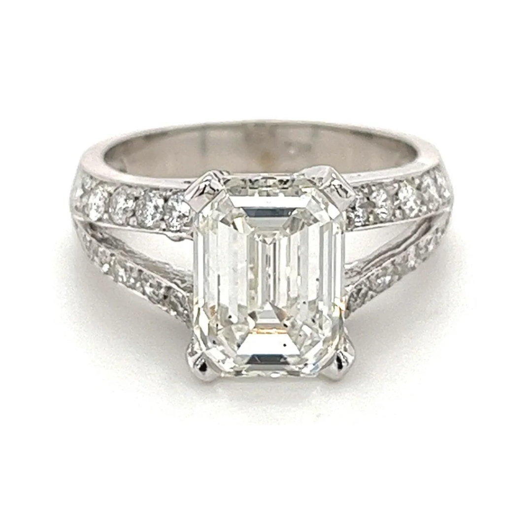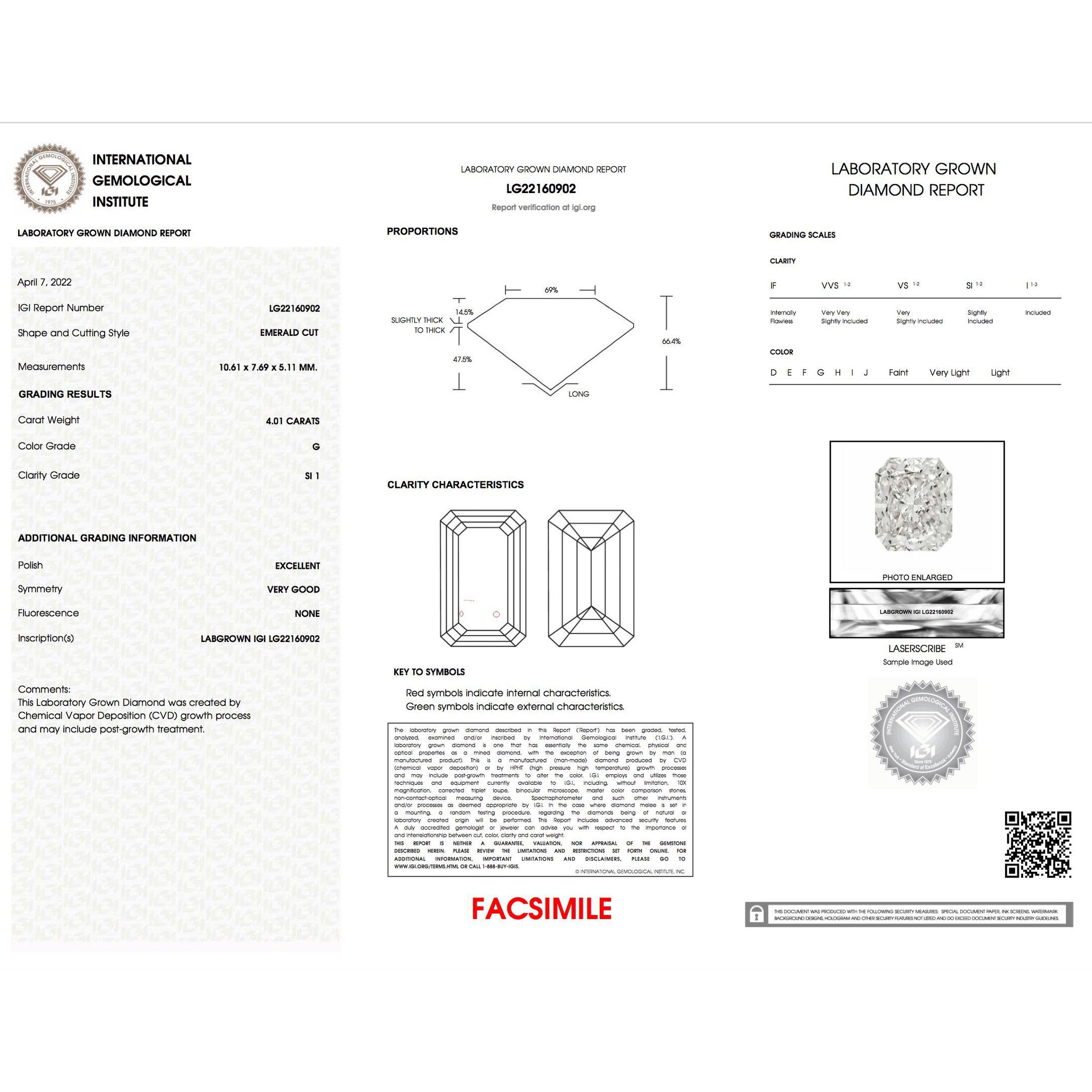 4.01-carat Emerald cut Lab-grown diamond Engagement ring in white gold. 4.01 carat, emerald cut, G color, SI1 clarity. The stone is set in a split shank white gold side stone ring with 1.20 carats in natural diamond side stones.