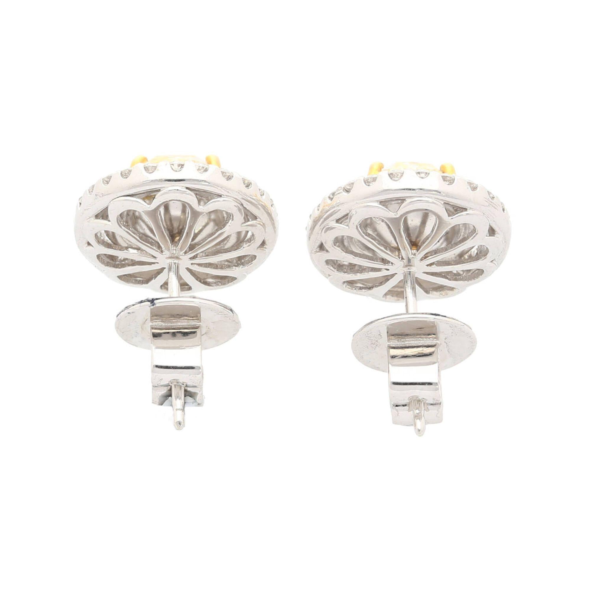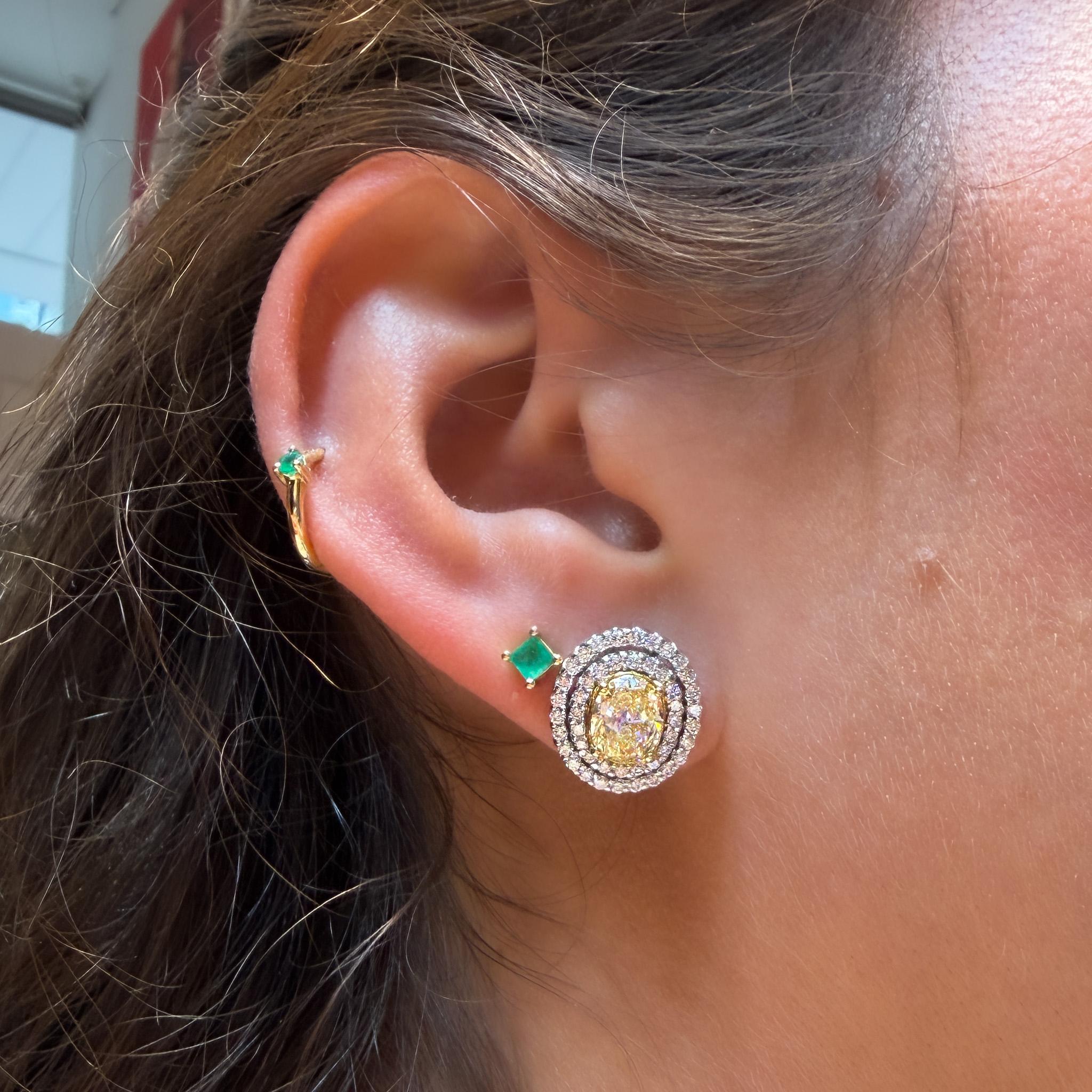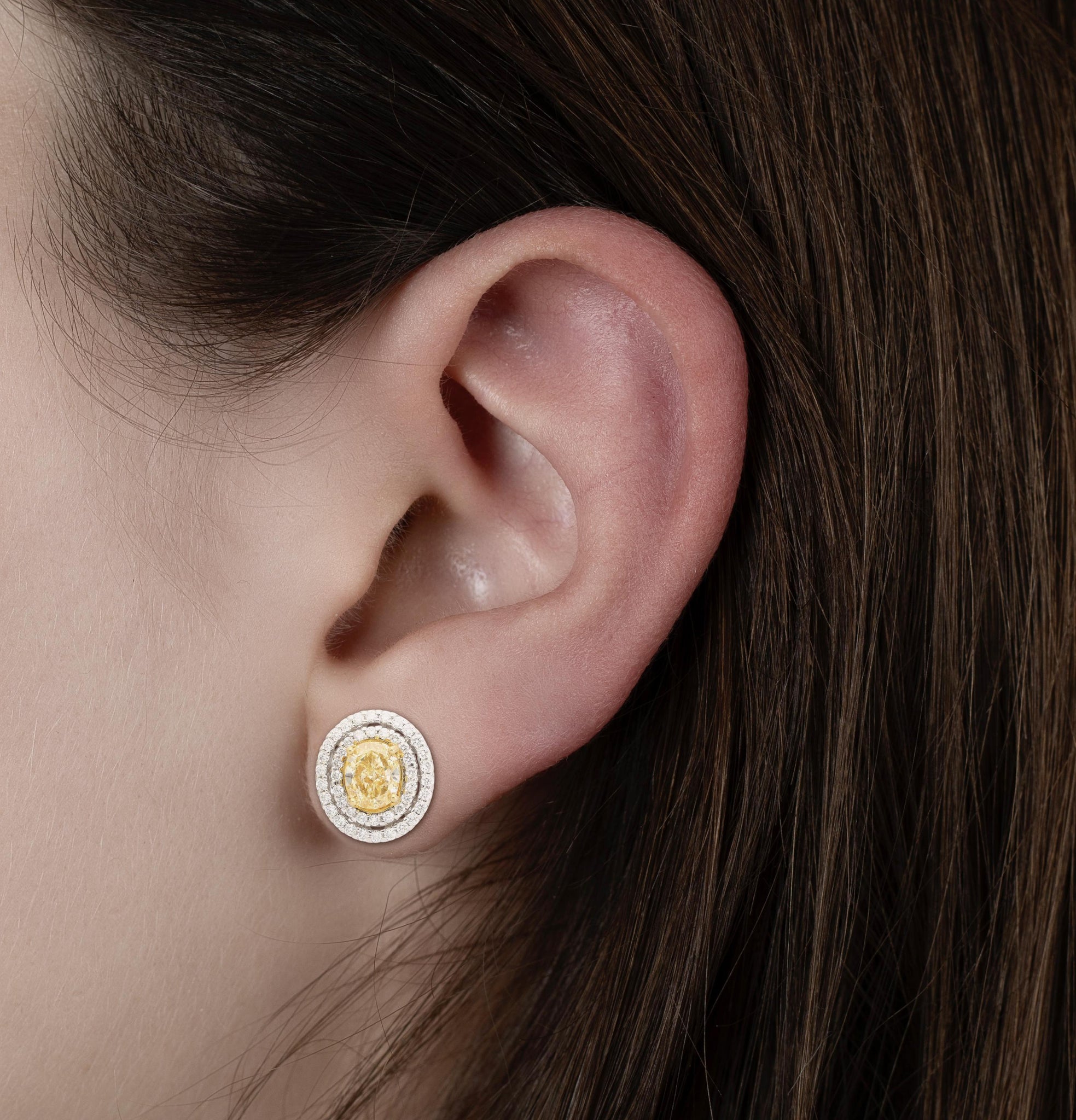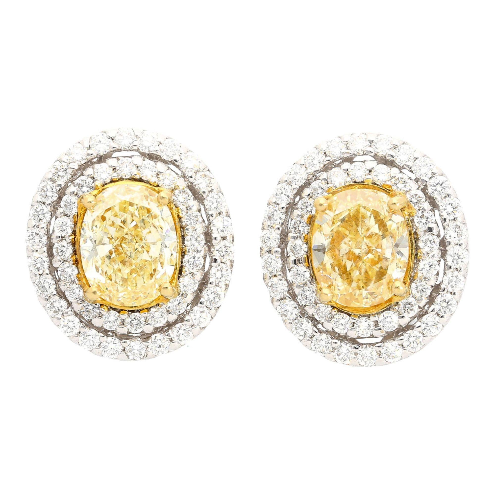 Each 7.7 x 6mm oval-cut fancy yellow diamond sits in yellow gold four-prong setting. An inner halo of white diamonds in white gold surrounds the yellow diamond. A second outer halo of larger white diamonds creates double halo effect measuring 14.63 x 13.08mm total. Post backs with butterfly closures in white gold.