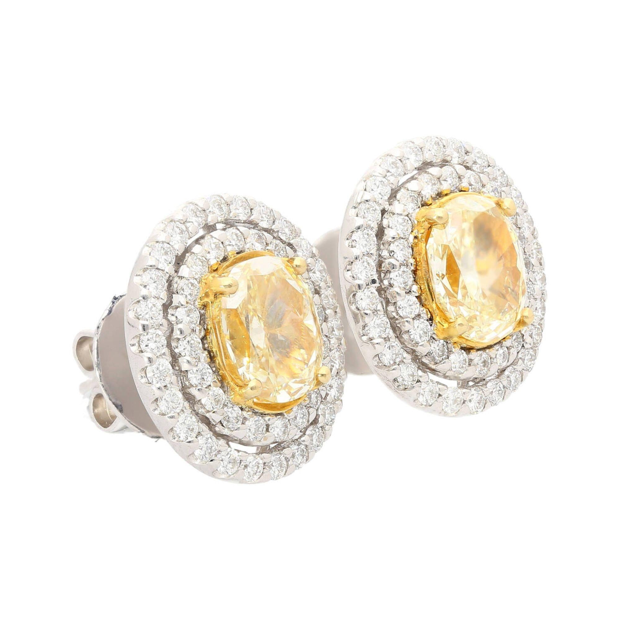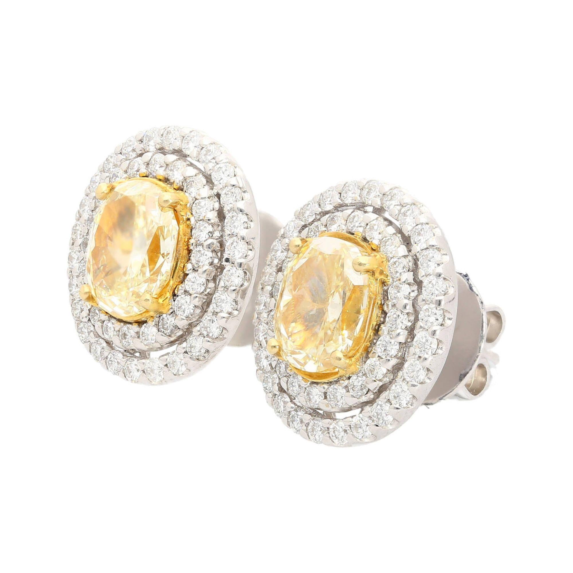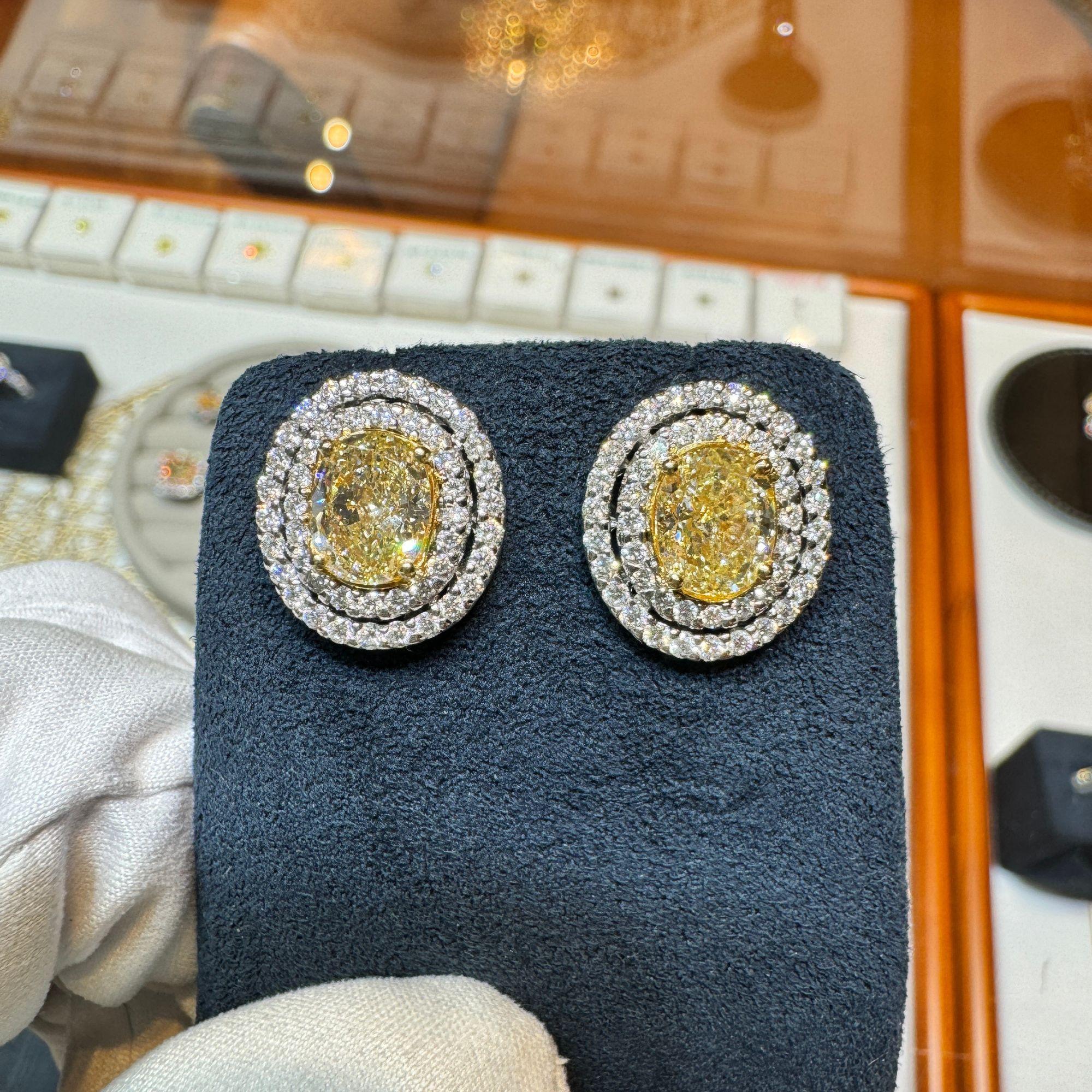 3.73 Carat TW Oval Cut Fancy Yellow Diamond Double Halo Stud Earrings