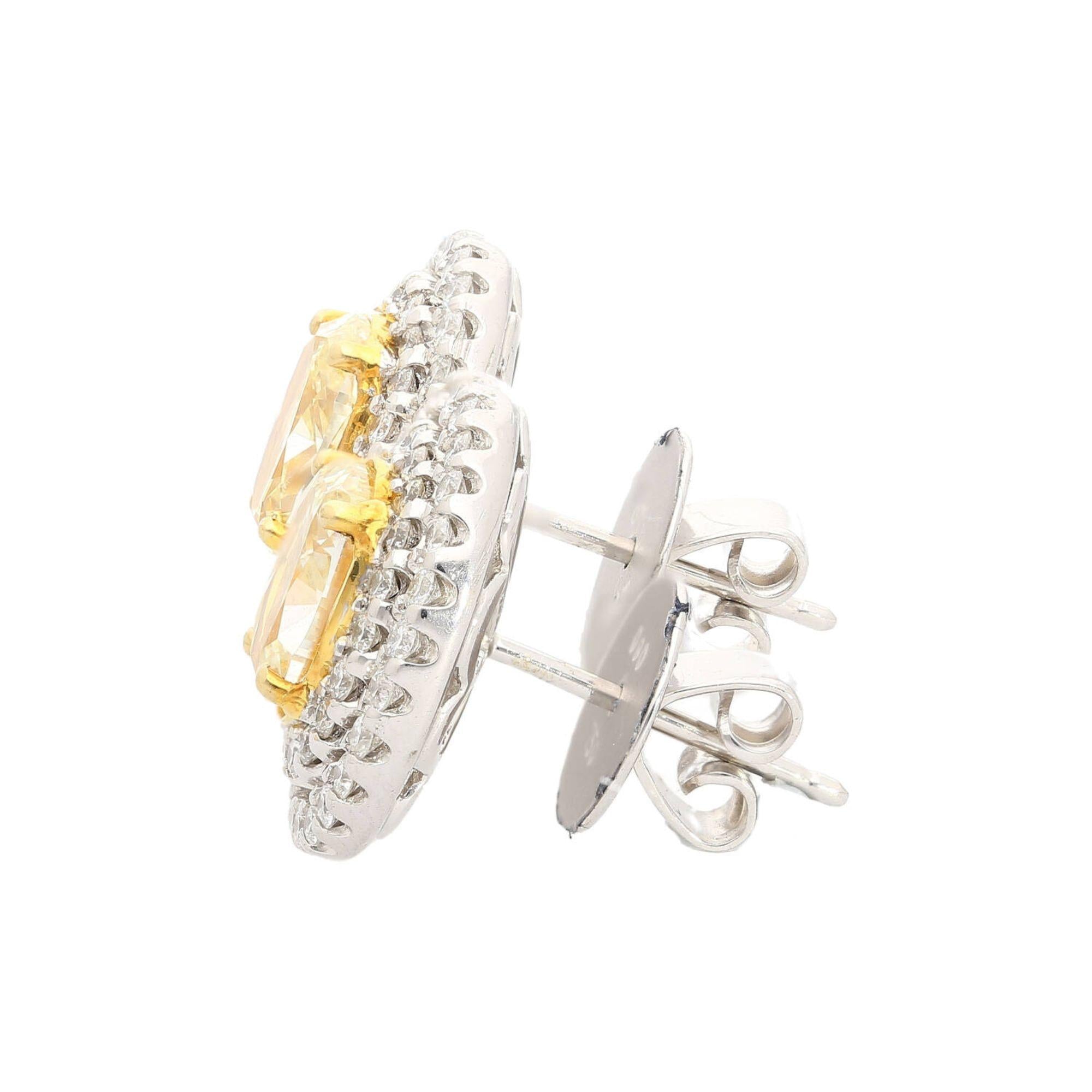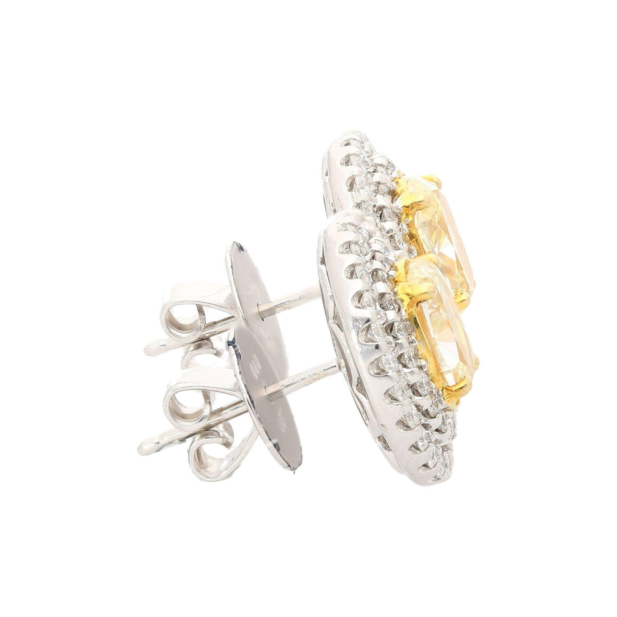 3.73 Carat Total Fancy yellow diamond stud earrings featuring 2.83 carats in Oval-cut yellow diamonds and 0.90 carats in white diamonds, all set in 18K gold. Post back closure, measuring 14.63 x 13.08mm, weighing 7.60 grams per pair.