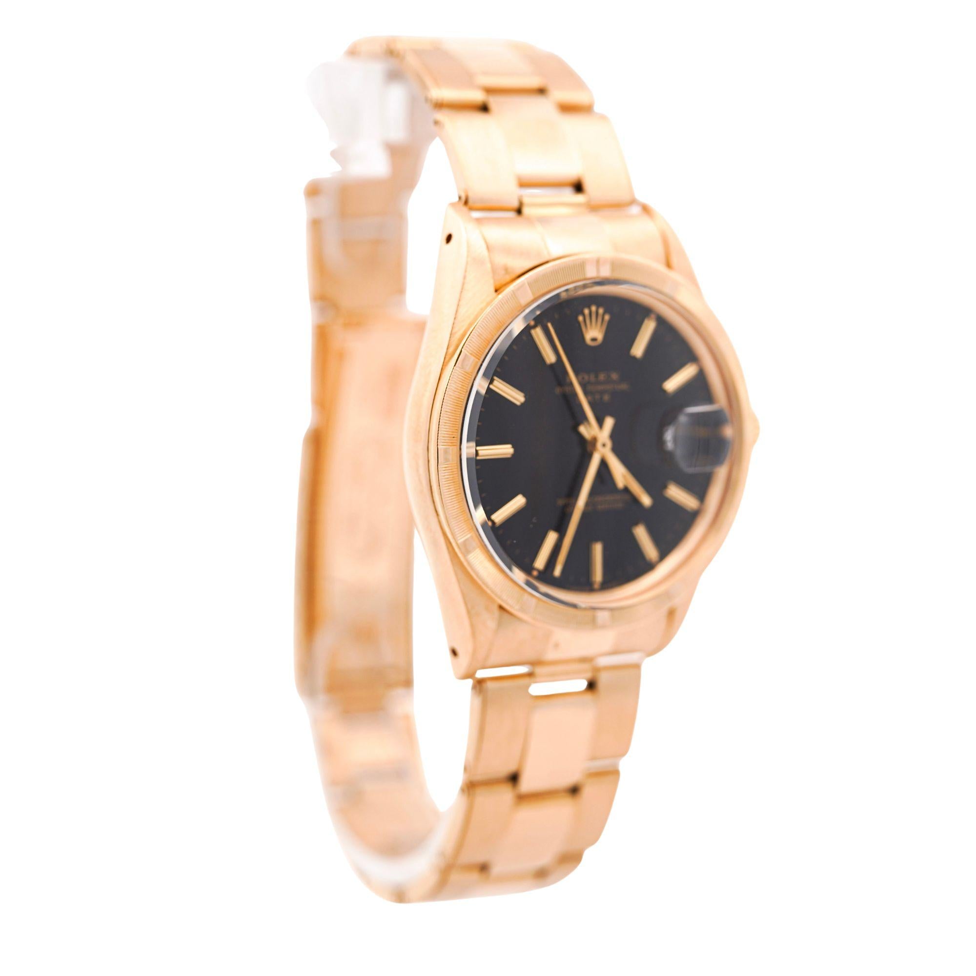 Rolex Oyster Perpetual Date featuring rare petroleum black gloss dial in 34mm 18K yellow gold case with engine-turned bezel and Oyster bracelet. European market piece weighing 104 grams in solid 18K gold, measuring 8 inches, circa 1975.
